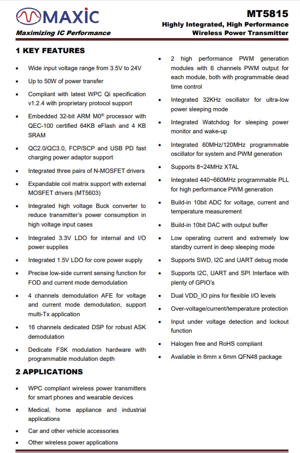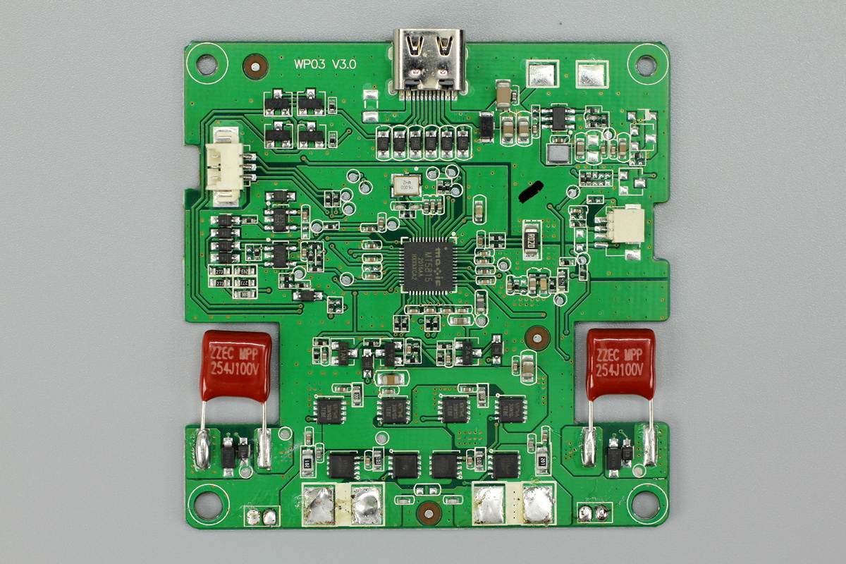無線充電主控芯片采用美芯晟MT5815。這是一款帶有USB-PD協(xié)議、高度集成的符合Qi標(biāo)準(zhǔn)的無線充電發(fā)射芯片,支持高達(dá)50W的輸出功率,向下兼容不受限。MT5815集成ARM M0 處理器,擁有卓越的高效率和緊湊設(shè)計(jì),適用于各種低成本、低功耗應(yīng)用,可廣泛應(yīng)用于為5G智能終端、智能可穿戴設(shè)備、智能家居、物聯(lián)網(wǎng)、智能家電進(jìn)行無線充電的設(shè)備。充電頭網(wǎng)此前已對(duì)該芯片做了相關(guān)報(bào)道。