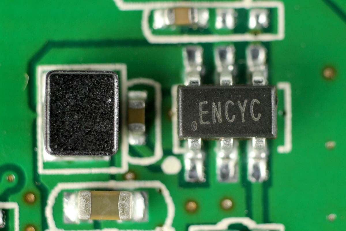 矽力杰 SY8201 同步整流降壓轉(zhuǎn)換器,將輸入降壓為無線充內(nèi)部元件供電,輸出電流1A,輸入耐壓27V。左邊是對(duì)應(yīng)的降壓電感。