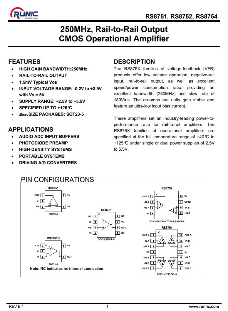 潤(rùn)石 RS8751 單運(yùn)放,用于信號(hào)處理。
