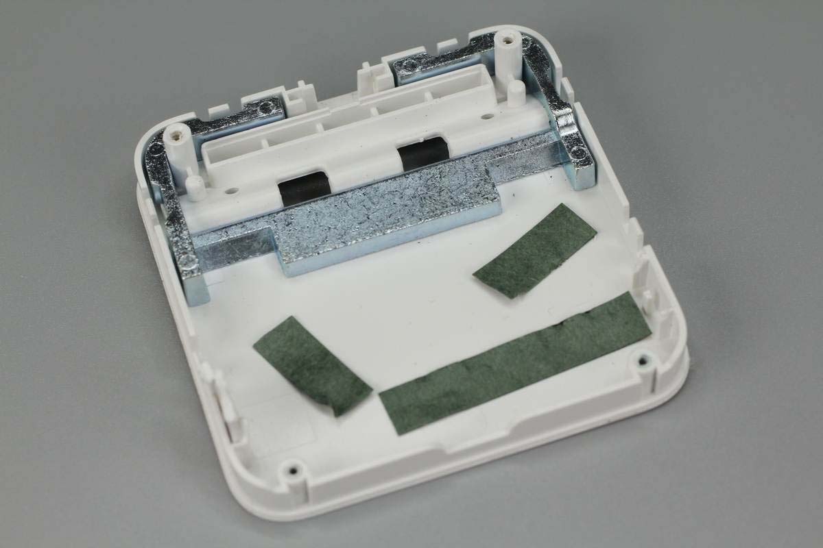 底座外殼上固定有鐵塊配置,此外貼有三條青稞絕緣紙。