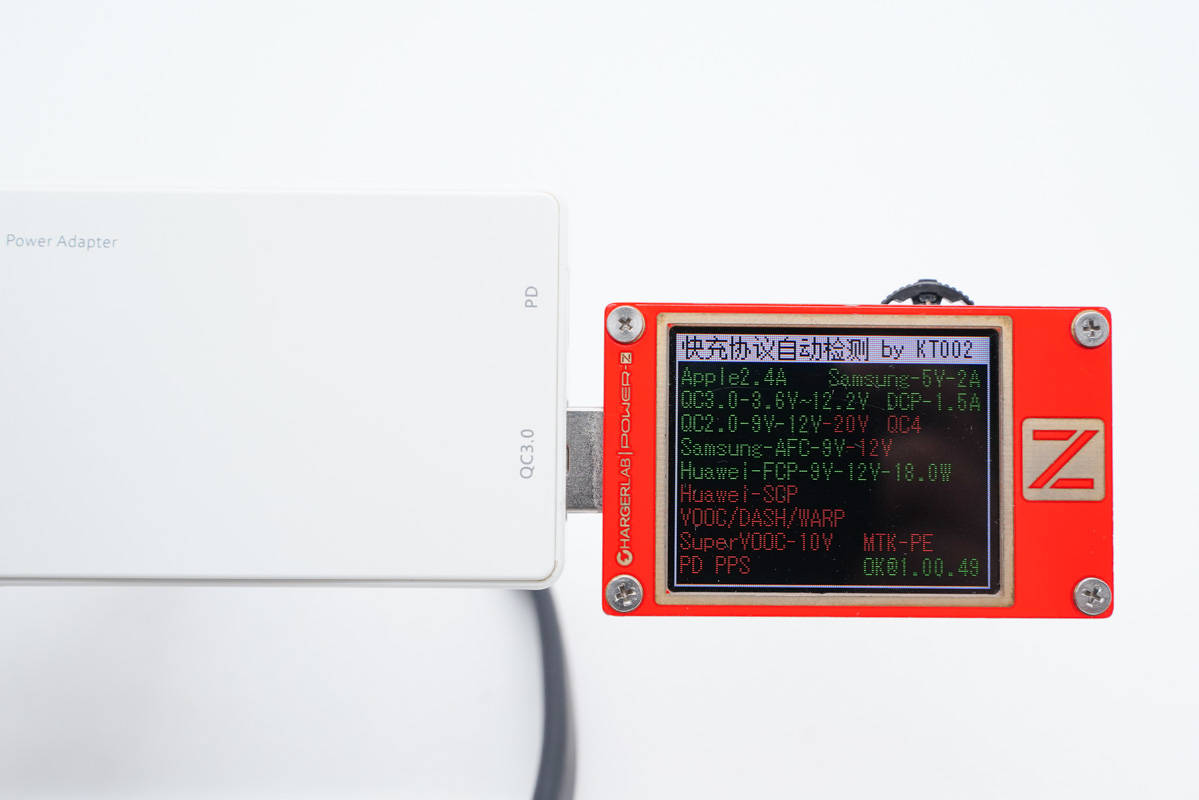 使用ChargerLAB POWER-Z KT002測得USB-A口支持Apple 2.4A、Samsung 5V2A、DCP協議,以及QC2.0/3.0、AFC、FCP快充協議。