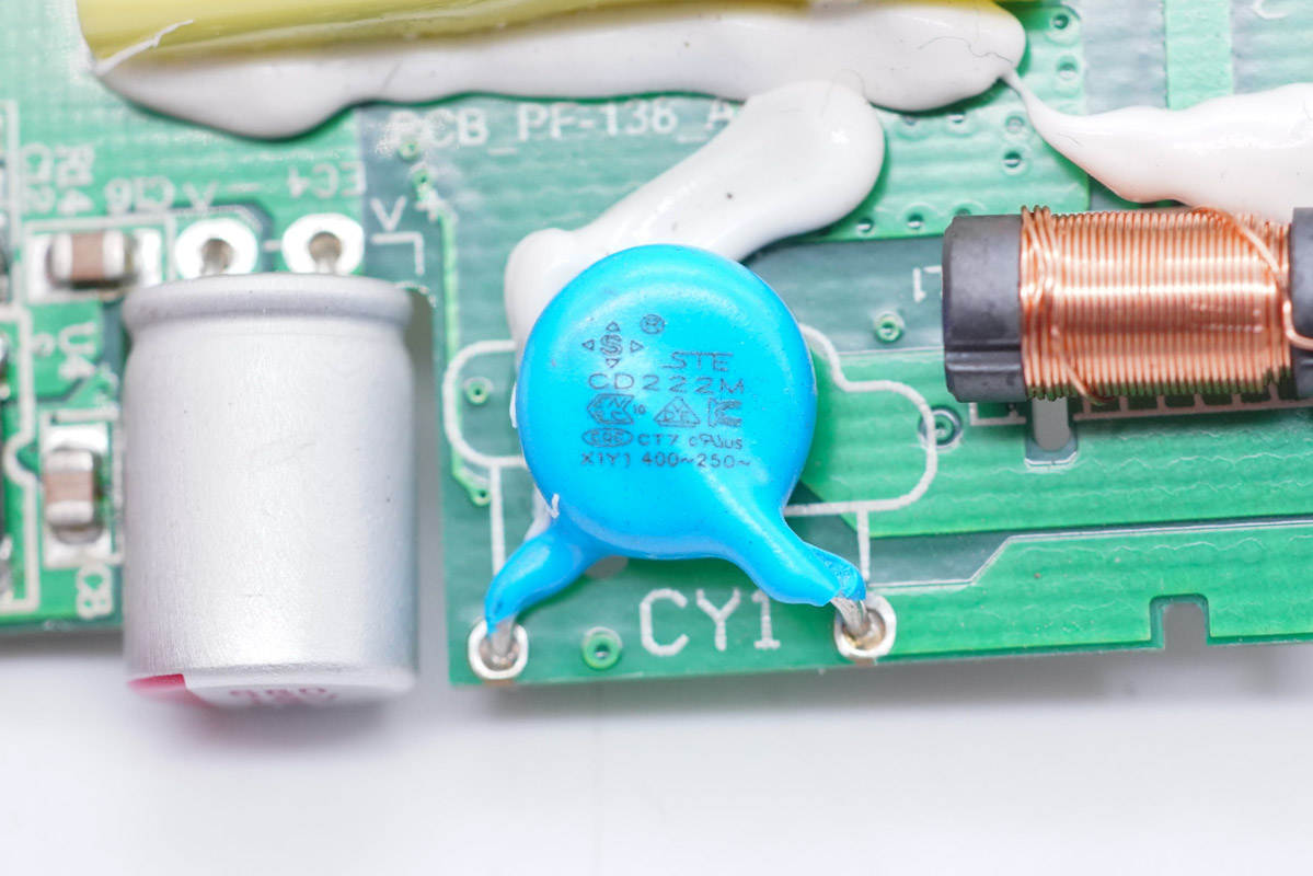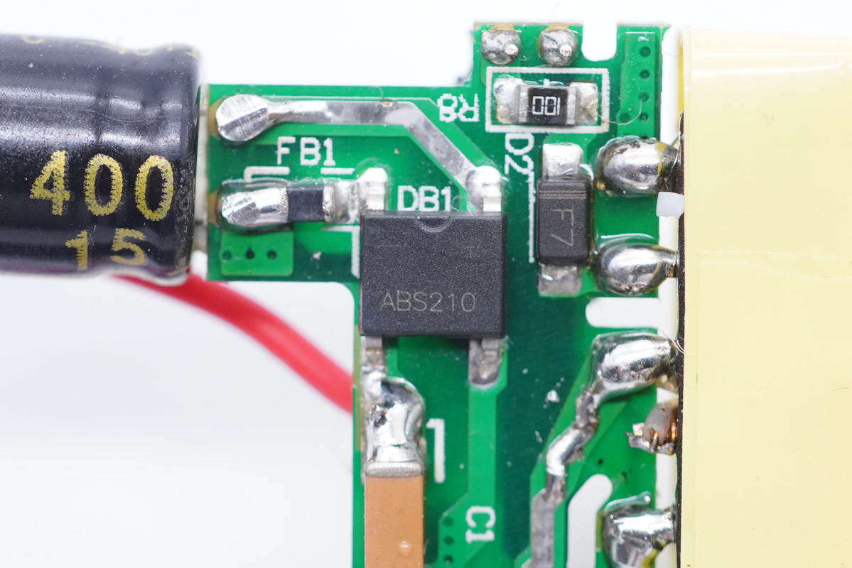 通過PCB板正背面電路觀察發現,這款充電器采用開關電源寬范圍輸出,一顆協議芯片通過光耦控制雙口輸出電壓的經典架構。下面我們就從輸入端開始一一了解各元器件。