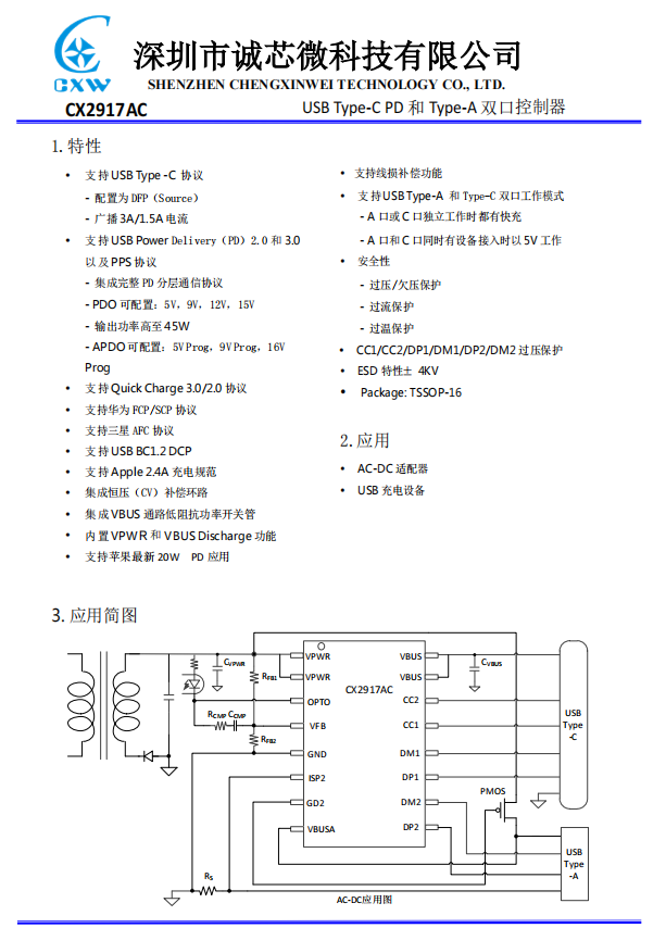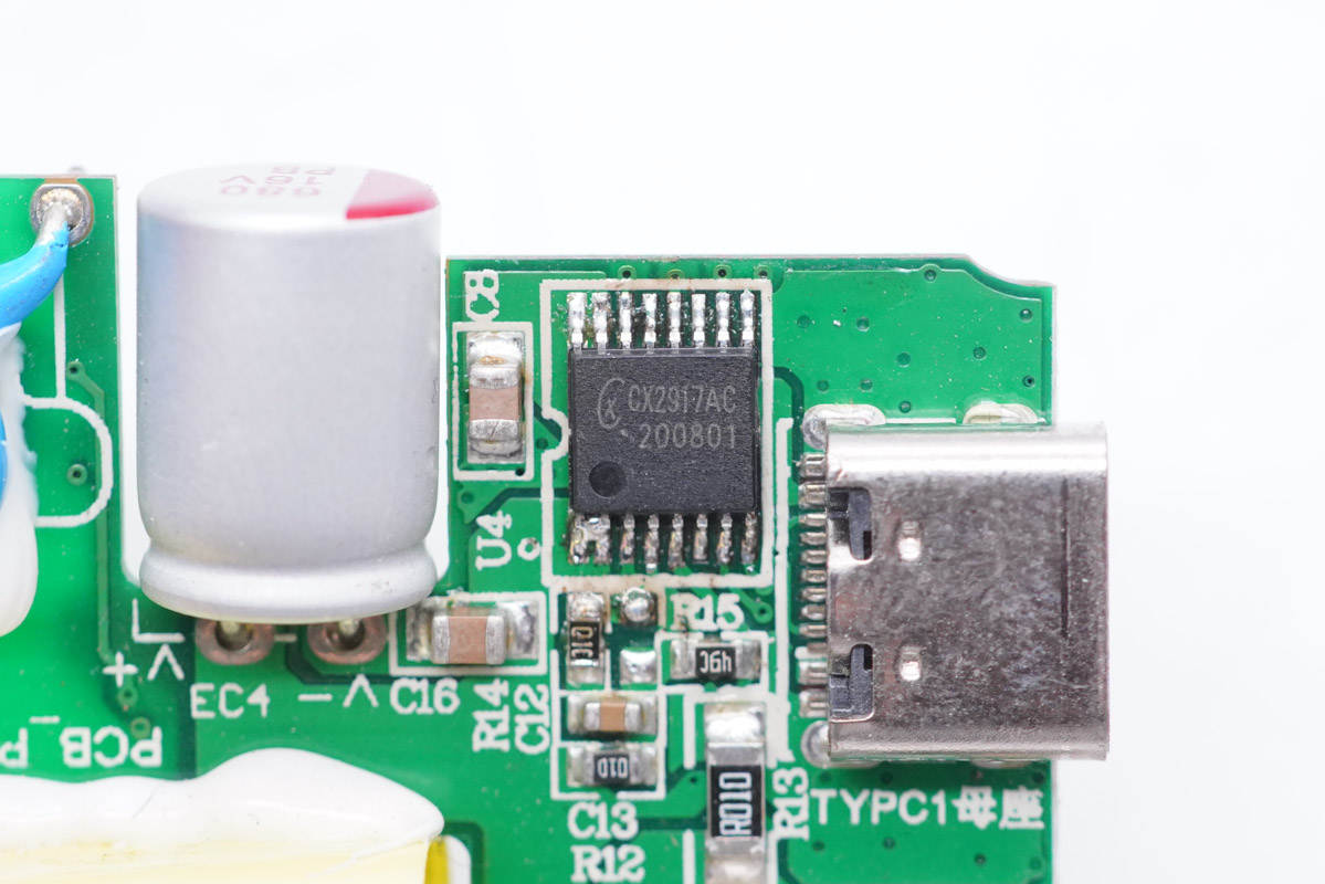 協議芯片也是采用誠芯微CX2917AC,這是一顆USB-C和USB-A雙口控制器,兼容PD2.0/3.0、PPS、QC2.0/3.0、華為FCP/SCP、三星AFC、Apple 2.4A等協議,支持蘋果最新20W PD應用。此外支持過壓/欠壓保護、 過流保護、過溫保護,采用TSSOP-16封裝。