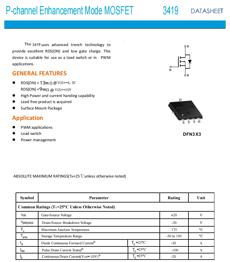 輸出VBUS開關管采用誠芯微3419,PMOS管,耐壓30V,DFN3x3封裝。