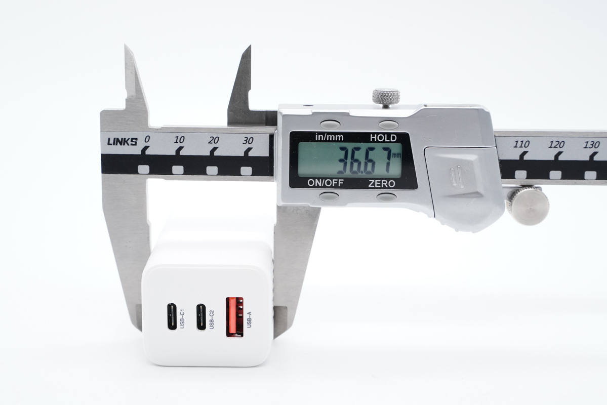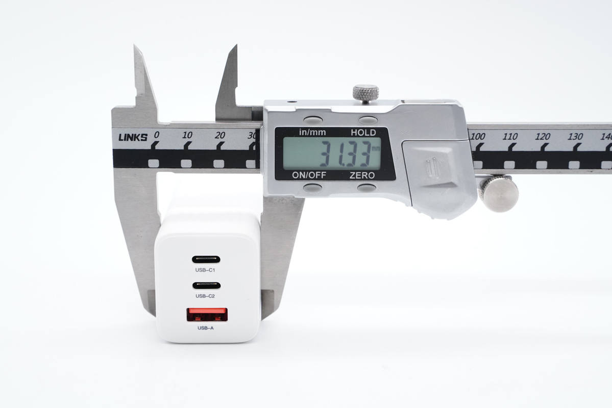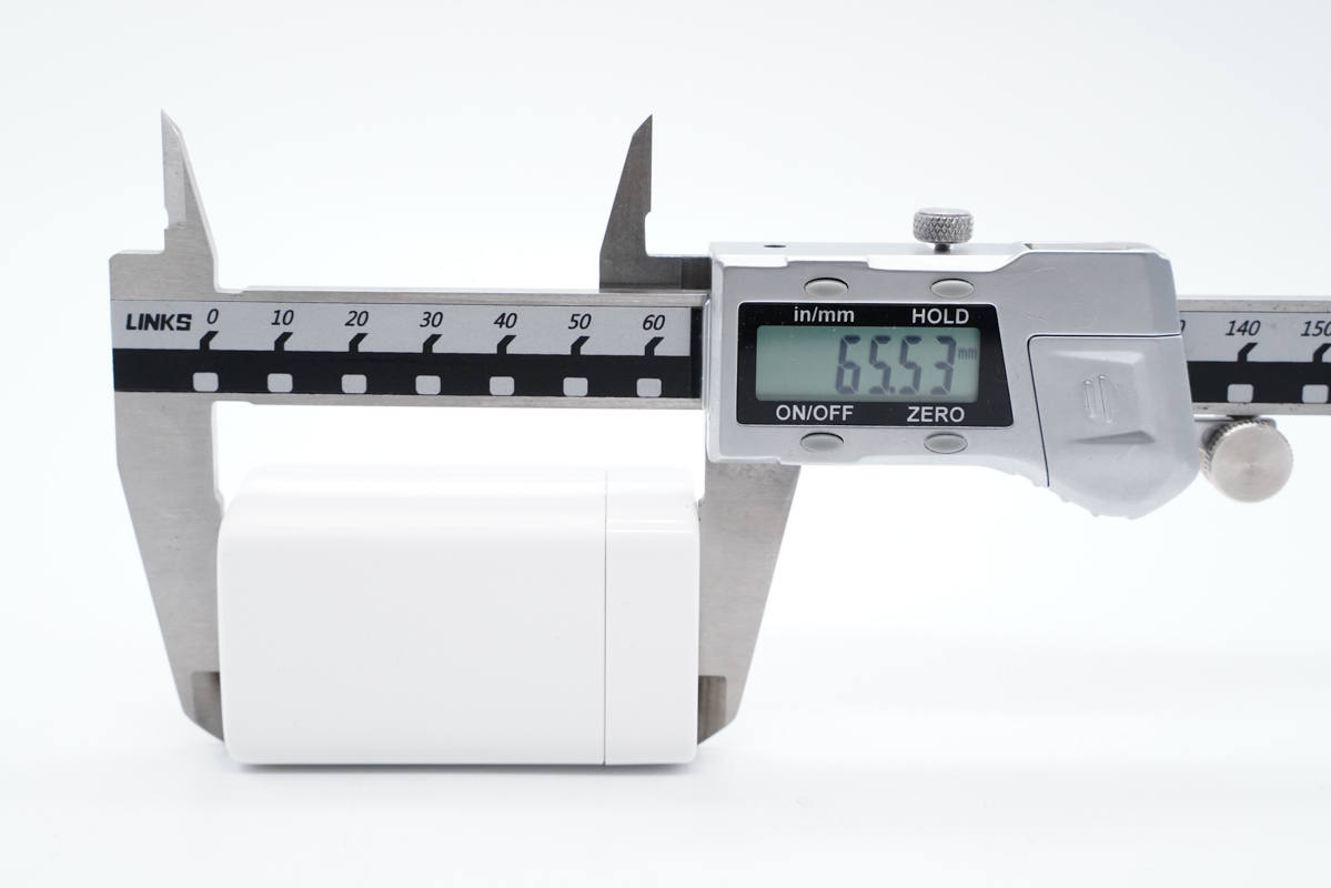 使用游標卡尺實測充電器機身長度為65.53mm。
