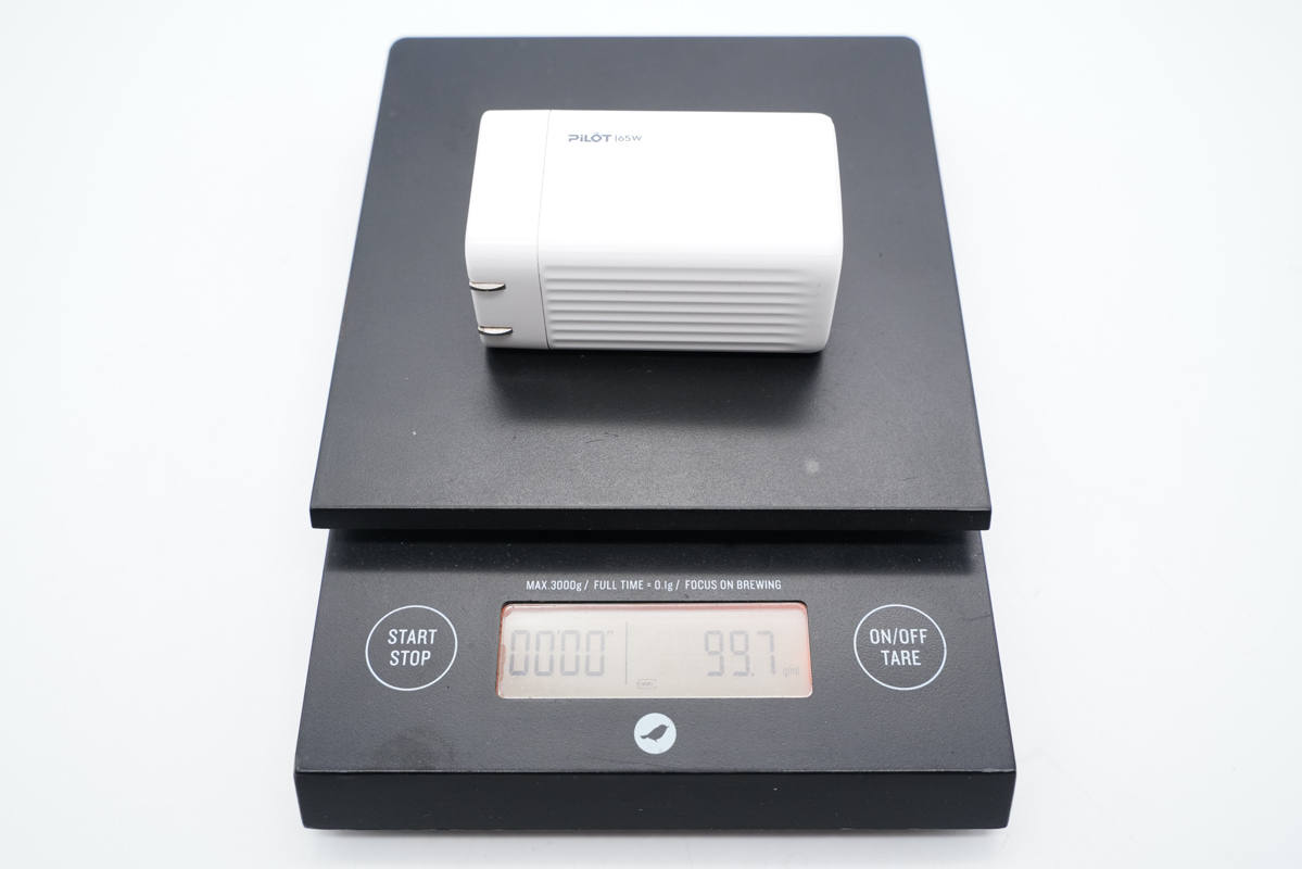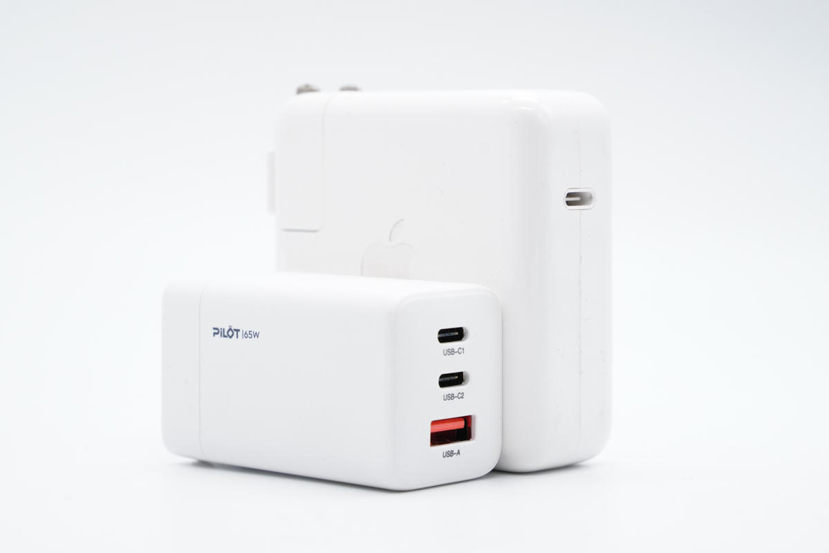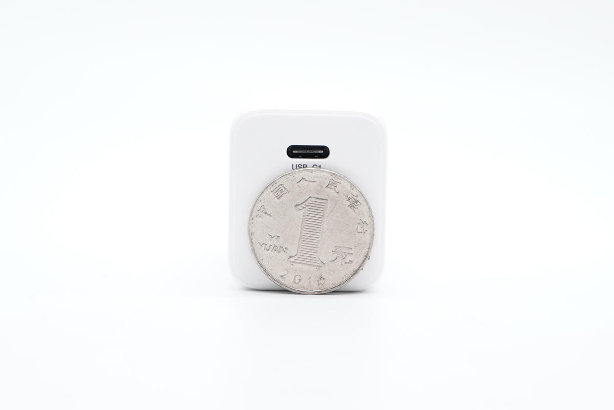 和蘋果61W充電器直觀對比,體積優(yōu)勢非常明顯。