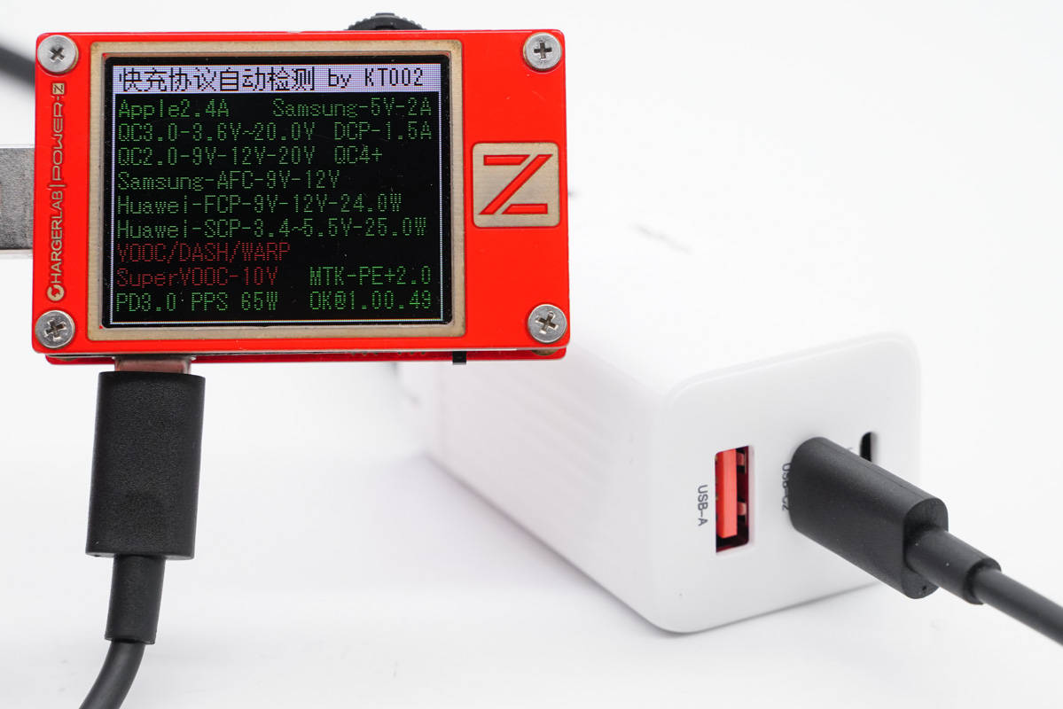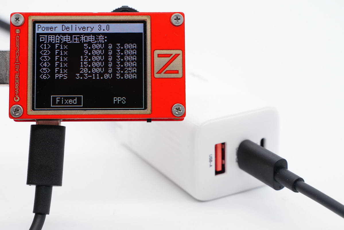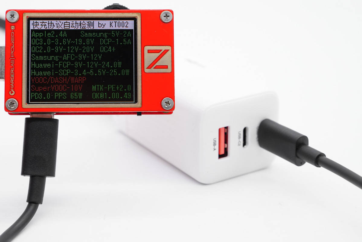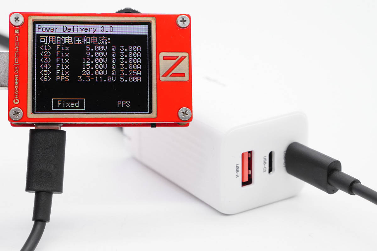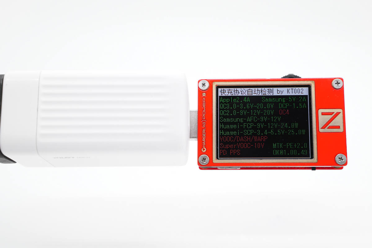 使用ChargerLAB POWER-Z KT002檢測USB-C1口輸出協(xié)議,顯示支持Apple 2.4A、Samsung 5V2A、DCP協(xié)議,以及QC2.0/3.0、AFC、FCP、SCP、PE2.0、PD3.0、PPS多個快充協(xié)議。
