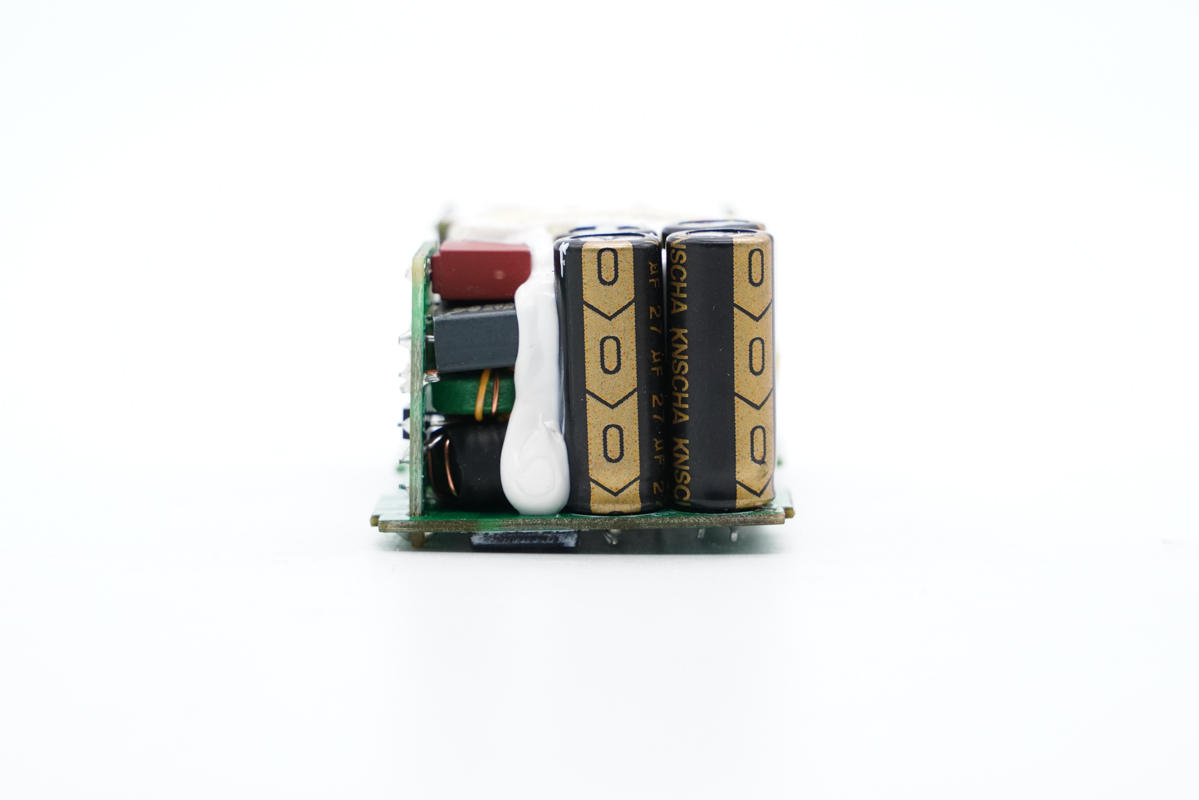 PCB板正面一覽,經(jīng)典的三段式布局設(shè)計,變壓器、電容等打膠加固,輸出端母座均焊接在小板上。