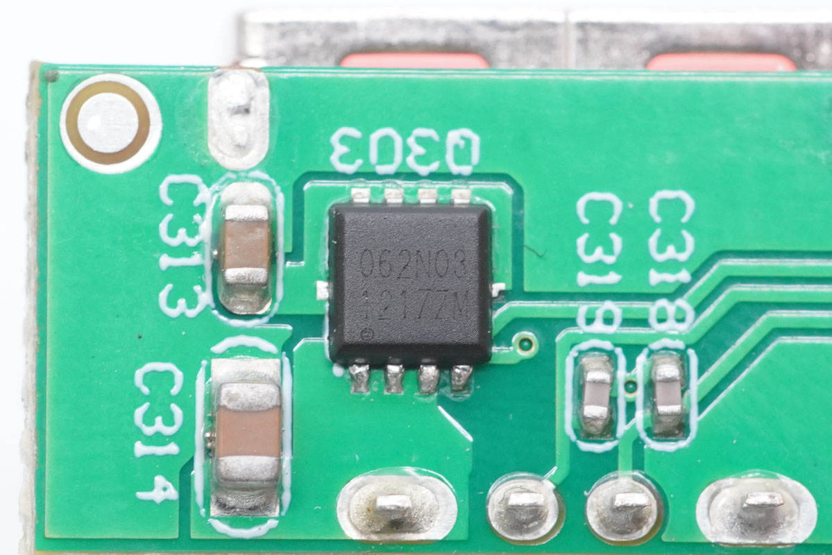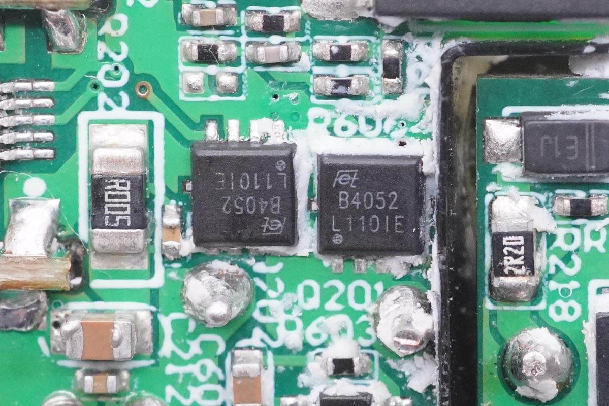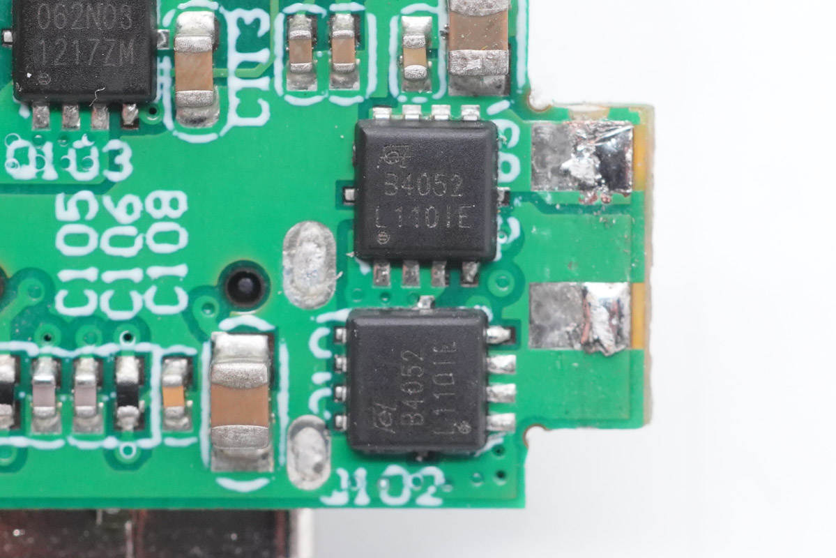 外掛兩顆東沅FKBB4052 MOS管,耐壓40V,導(dǎo)阻8.5mΩ,為1A1C接口輸出同步整流降壓。