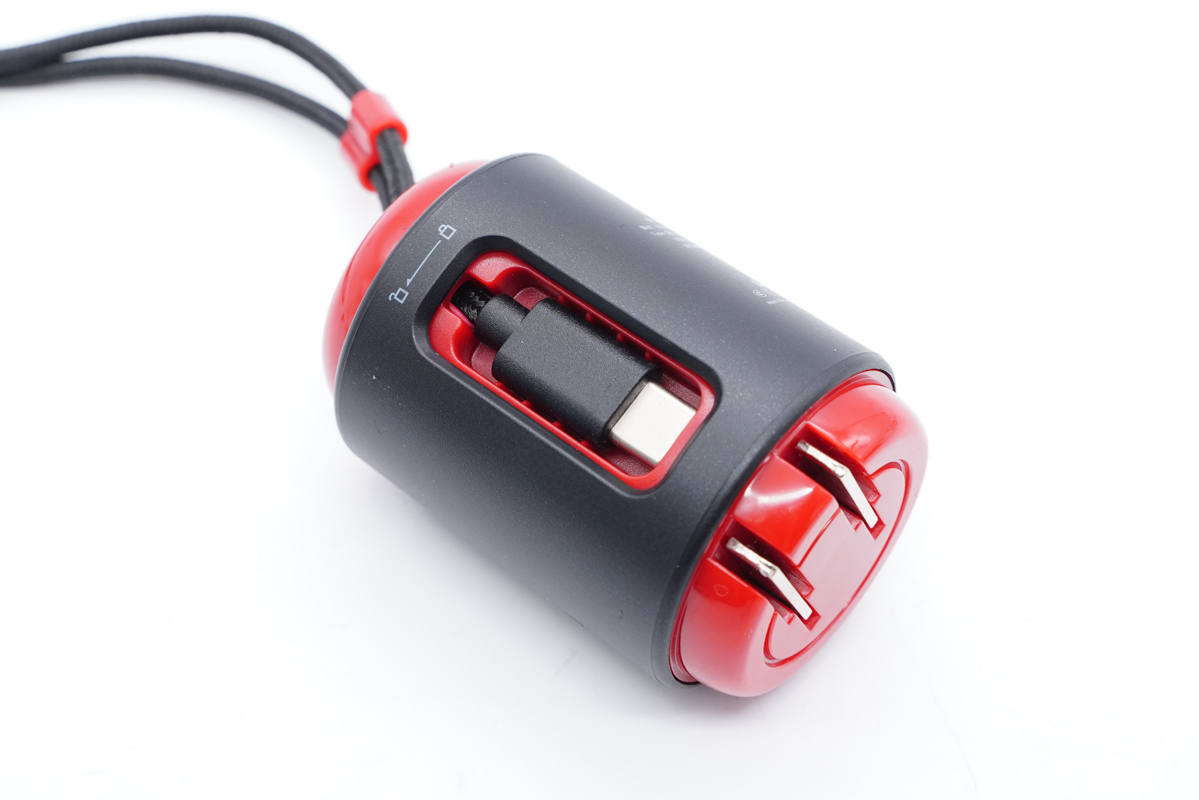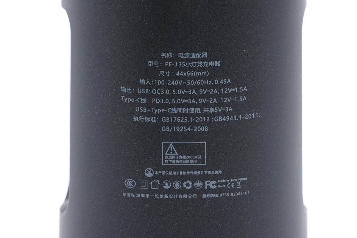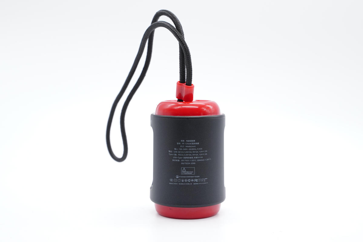 充電器采用圓柱造型設計,機身外套一圈黑色塑料殼,可進行小幅度旋轉。自帶USB-C輸出線纜,可充當提繩使用。產品形象物如其名,如小燈籠一般給力。