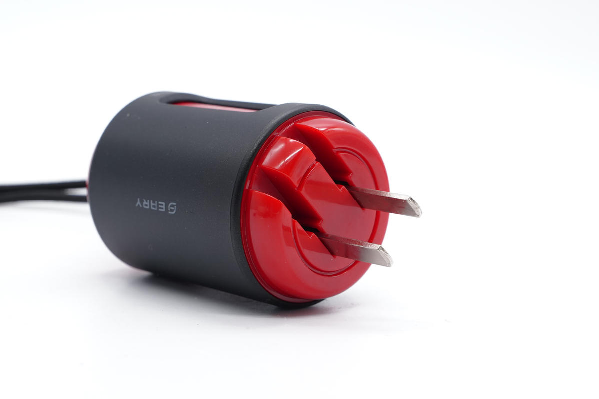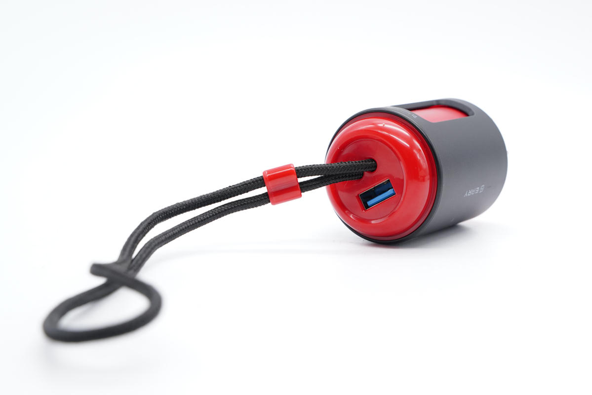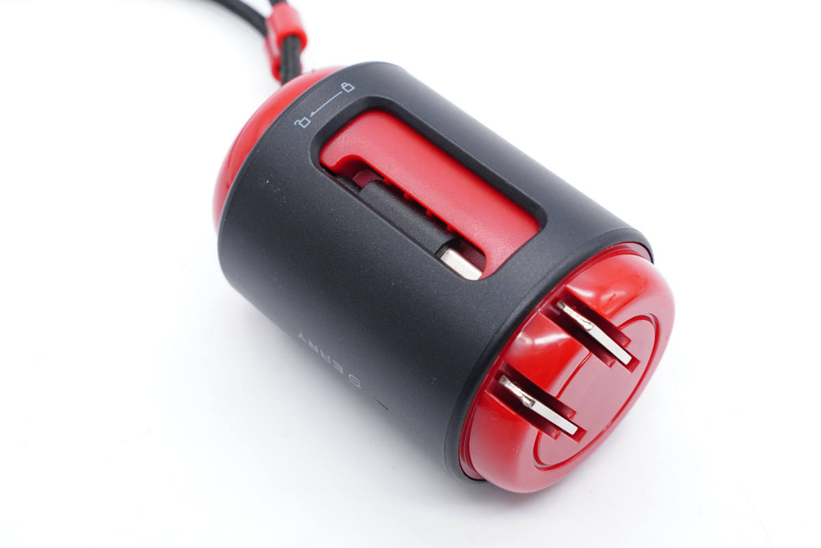 紅色機身殼頂部亮面設計,除輸出線纜外還配有一個USB-A接口,藍色膠芯。
