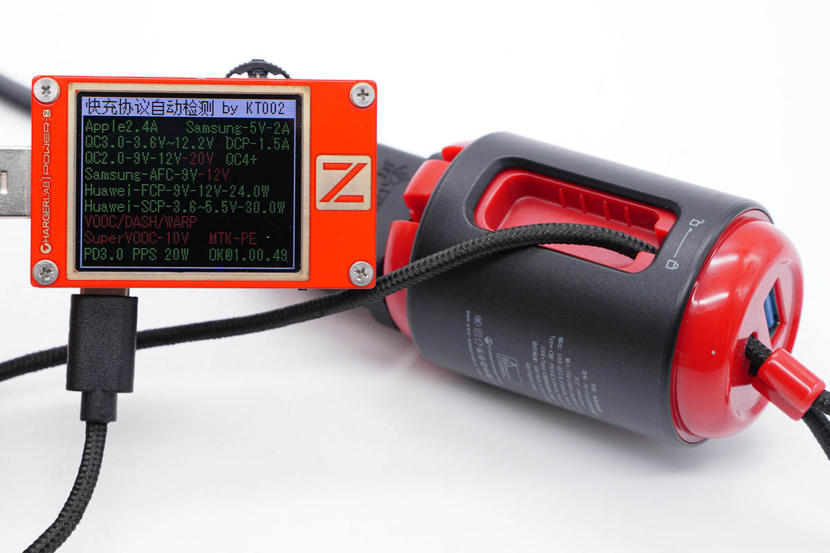 使用ChargerLAB POWER-Z KT002測得USB-A口支持Apple 2.4A、Samsung 5V2A、DCP協議,以及QC2.0/3.0、AFC、FCP、SCP快充協議。