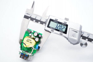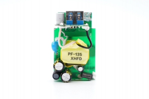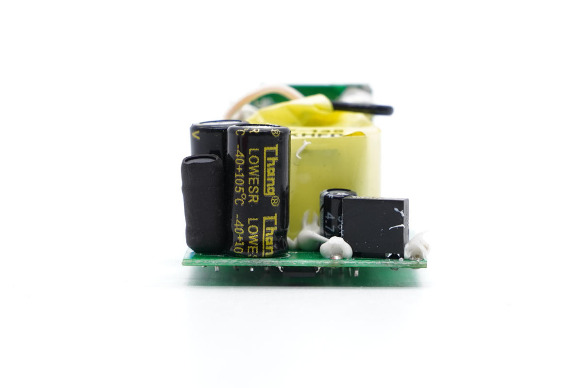 PCB板正面一覽,元器件很少,同時變壓器周圍留有很多空間,輸出端垂直焊接一塊小板。