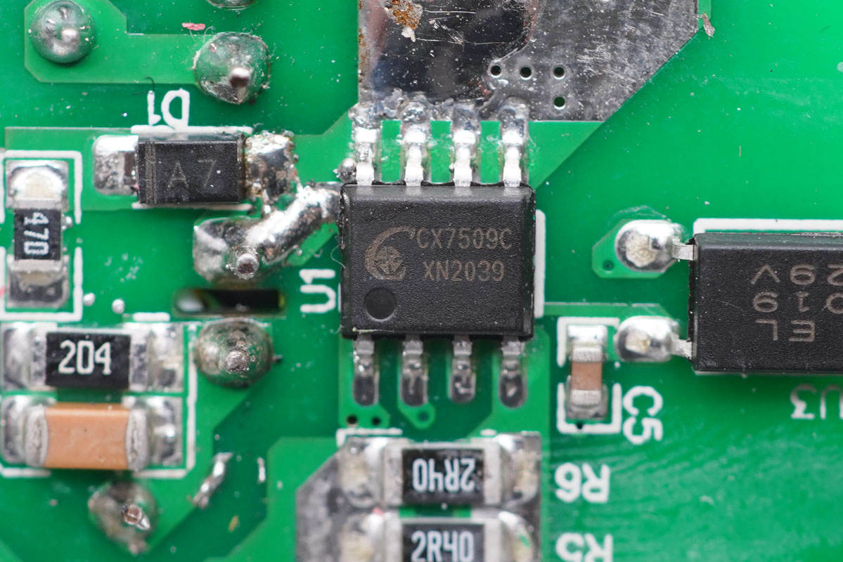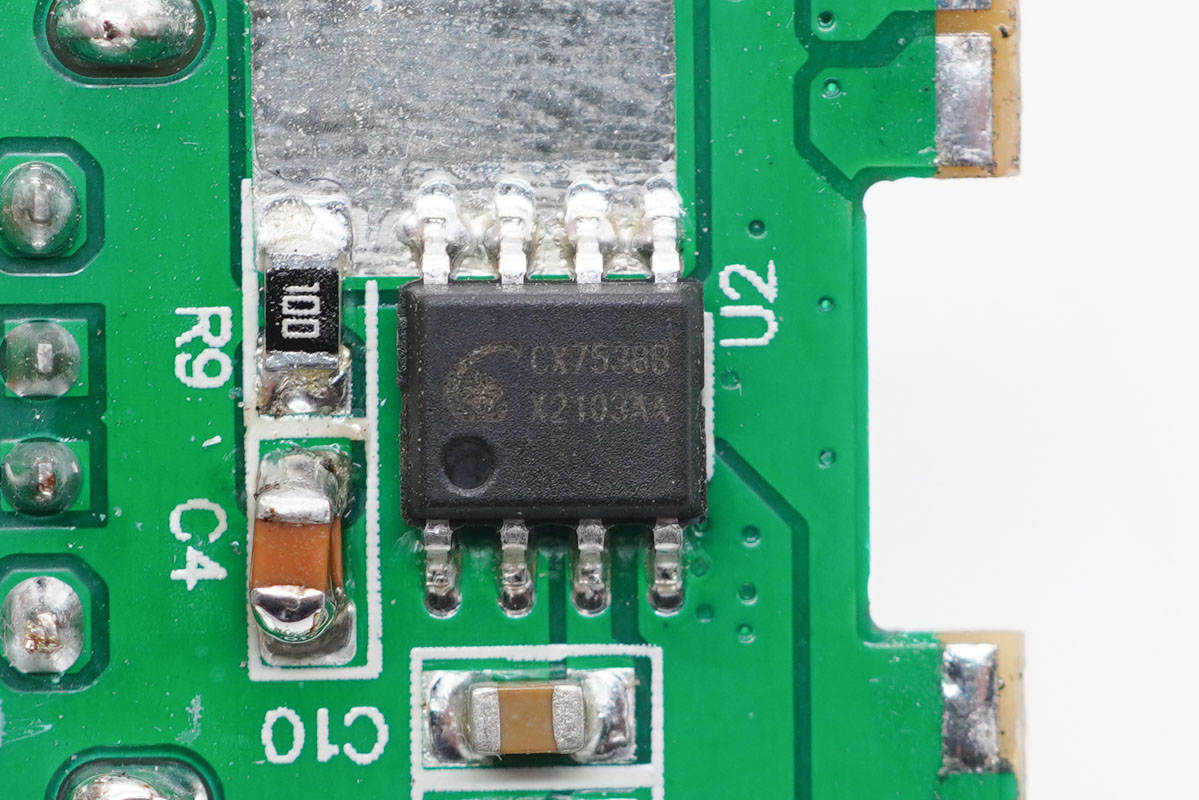充電頭網通過拆解了解到,PCBA模塊上的元器件已經顯得非常少了,同時還采用了誠芯微CX7509C+CX7538B+CX2919AC全套高集成快充方案,在這套方案加持下,外圍電路變得相當簡潔,更加凸顯產品的簡單,在設計和成本上也十分具有優勢!