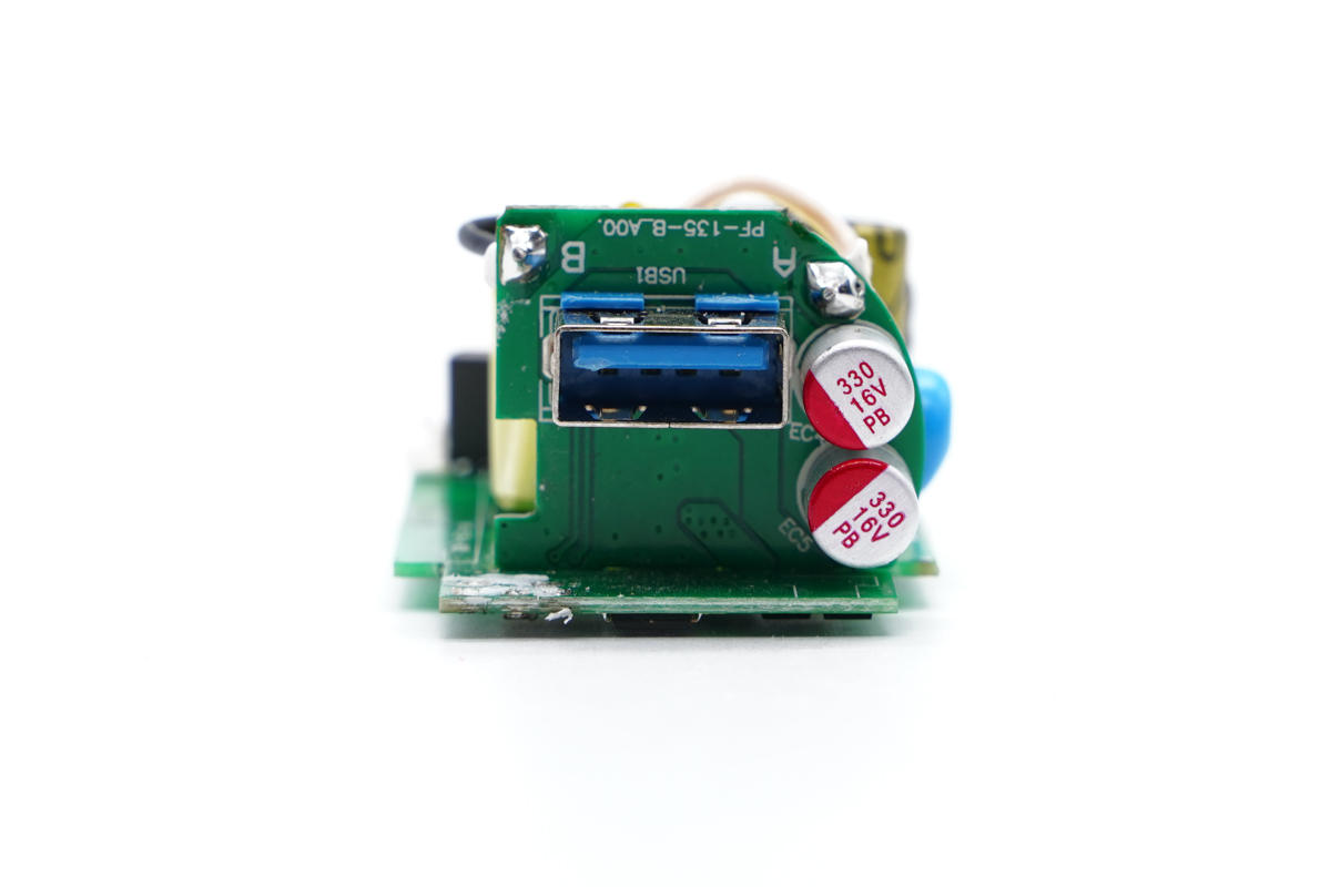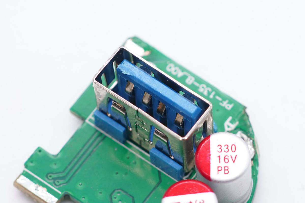 輸出端一覽,小板正面設有USB母座和兩顆固態電容。