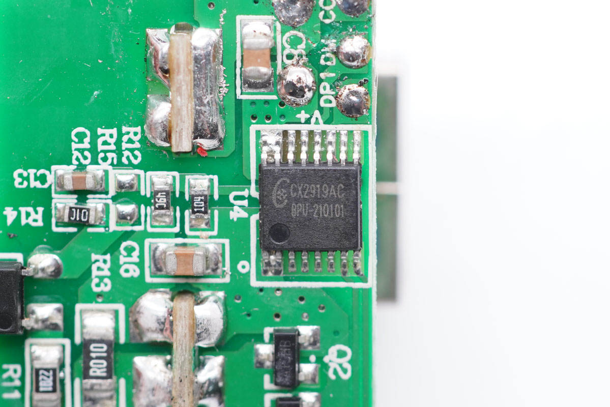 協議芯片也是采用誠芯微CX2919AC,這是一顆USB-C和USB-A雙口控制器,兼容PD2.0/3.0、PPS、QC2.0/3.0、華為FCP/SCP/HVSCP、三星AFC、Apple 2.4A等協議。此外支持過壓/欠壓保護、 過流保護、過溫保護,采用TSSOP-16封裝。