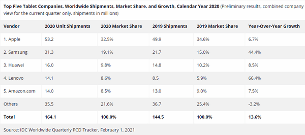 IDC數(shù)據(jù)顯示,2020年全年,全球平板電腦出貨量為1.641億臺(tái),同比增長13.6%。