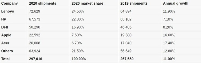 2021年,疫情襲來,在家辦公、上課常態(tài)化,國外尤其如此。全球平板、筆記本電腦出貨量在2020年恢復(fù)增長,