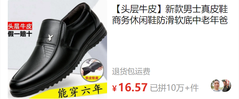 再比如這雙16.57元就能拼單成功的頭層牛皮真皮鞋,還能穿六年。