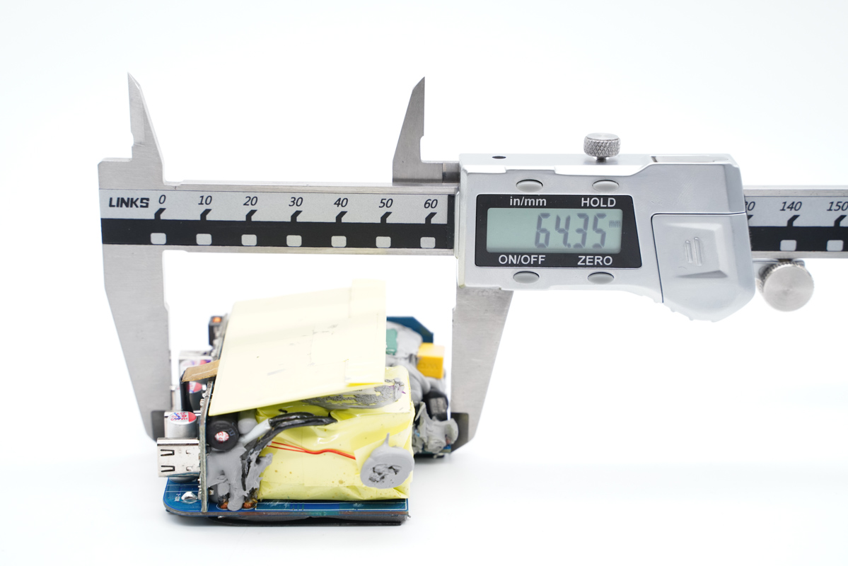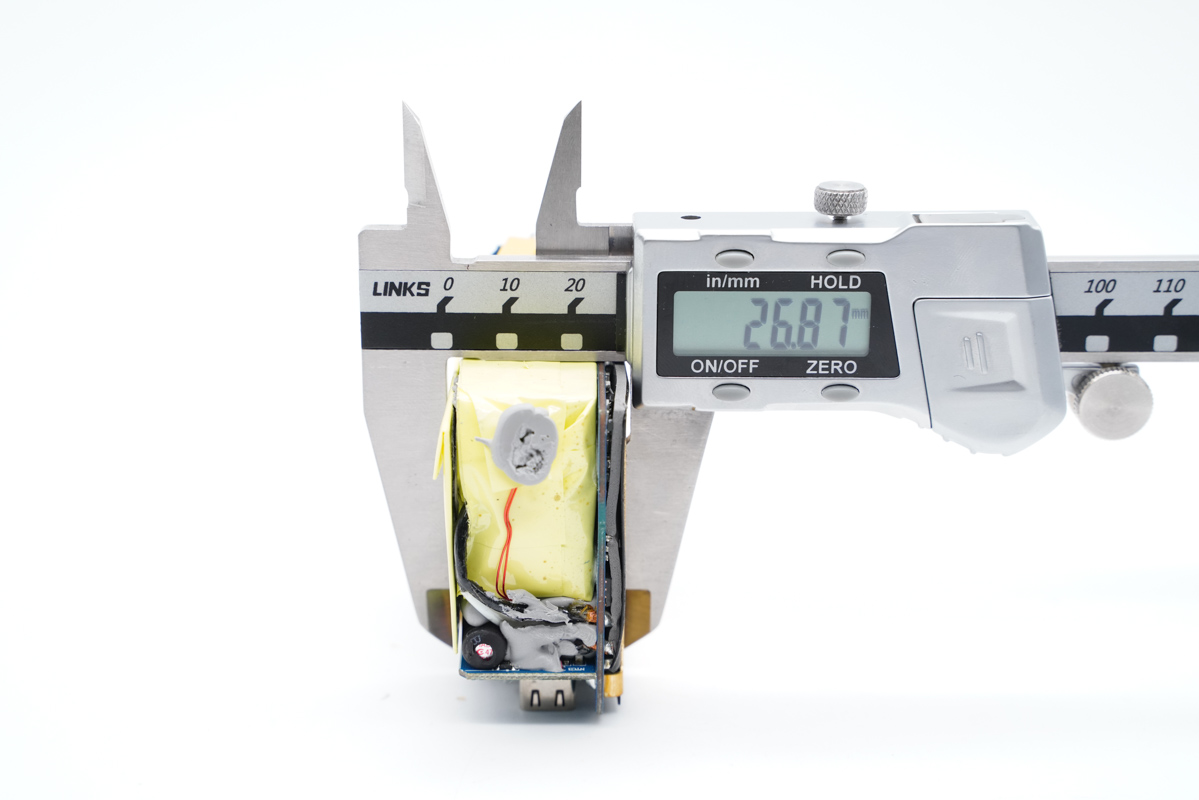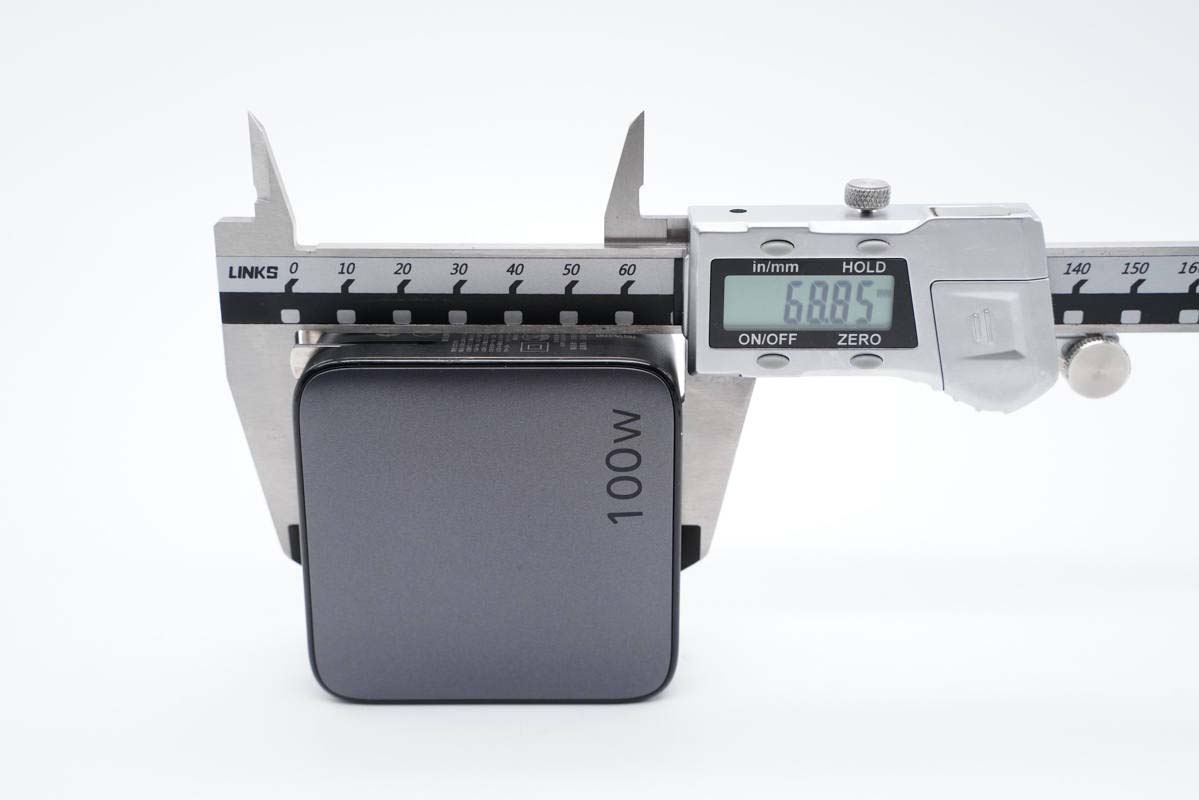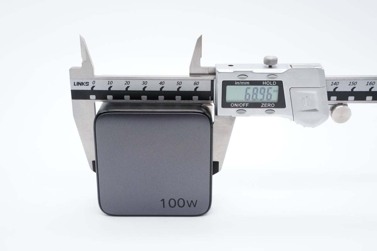 使用游標卡尺實測充電器機身長度為68.96mm。