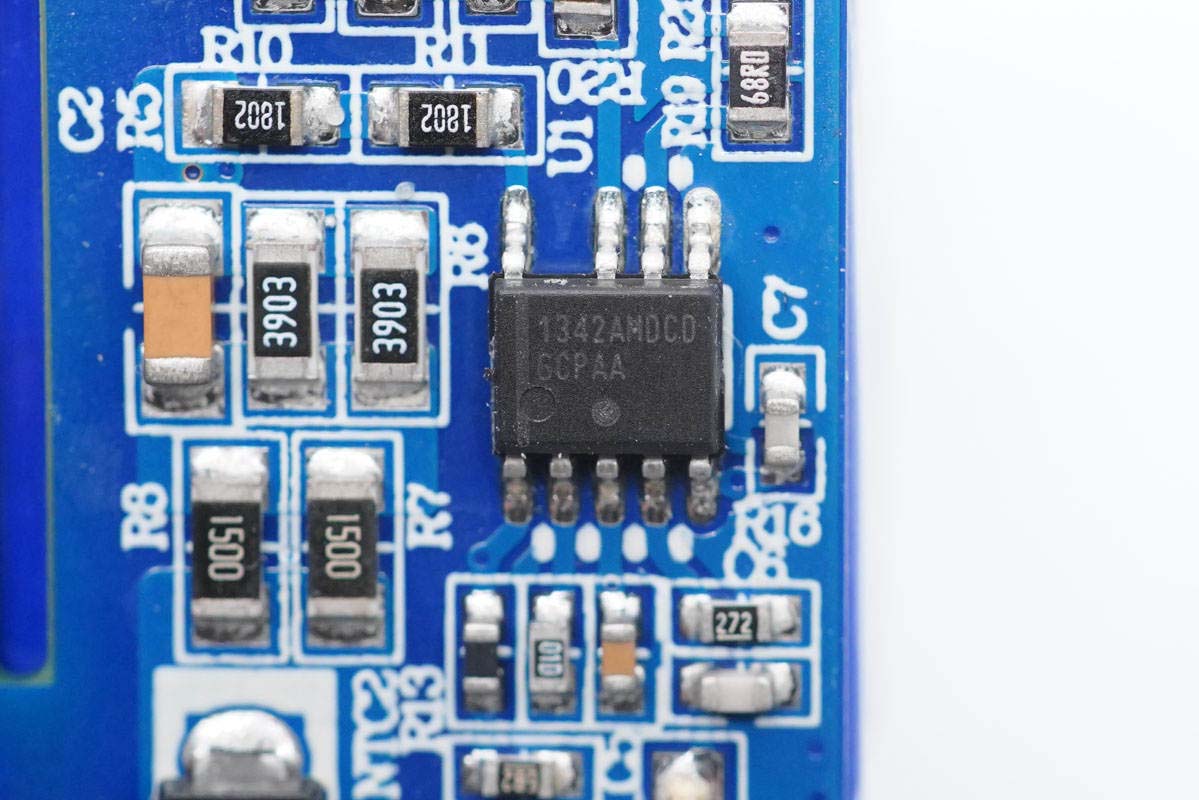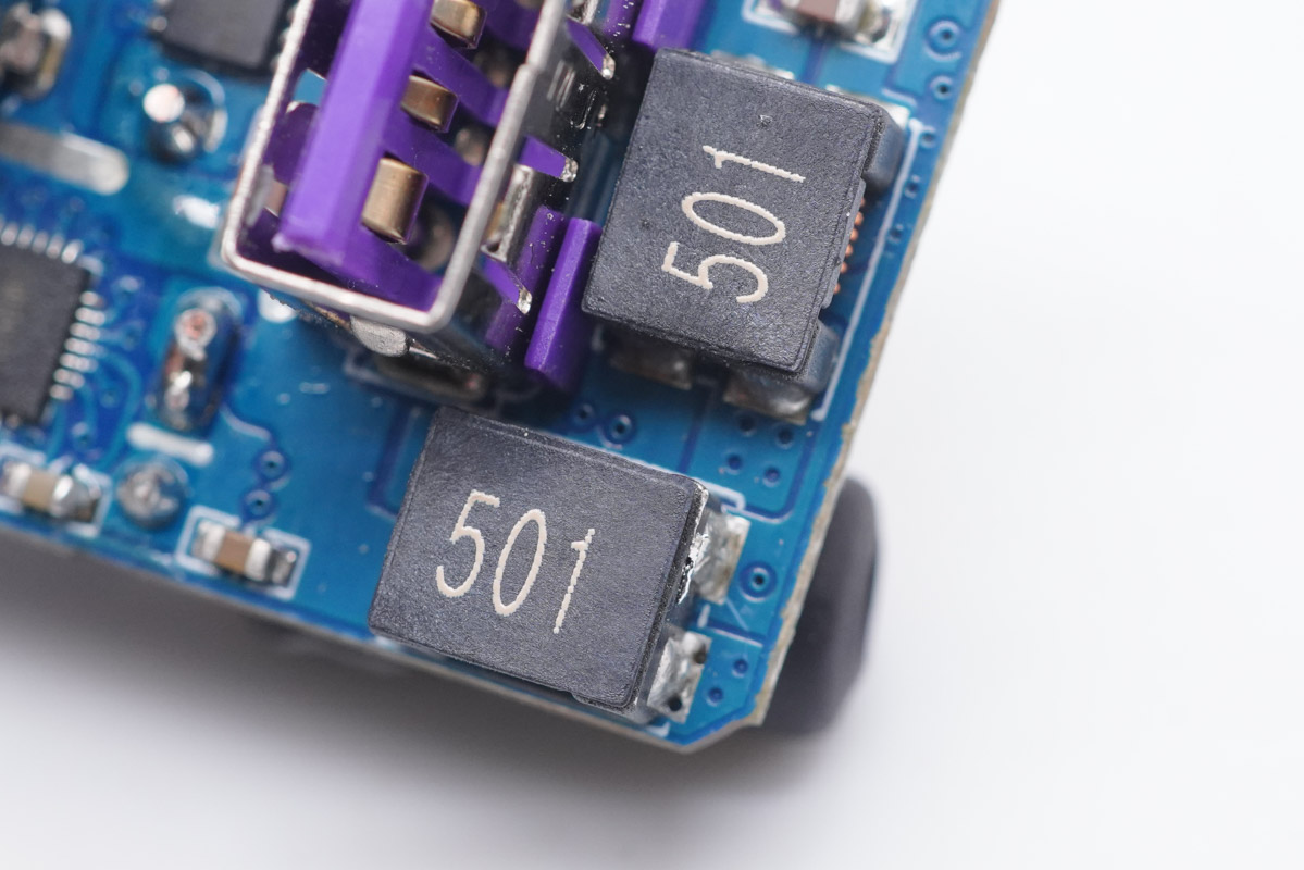 小板背面設有對應降壓電路的降壓電感、二次濾波電容以及一顆MCU,電容和電感均外套絕緣管保護,電感的已經被取掉。