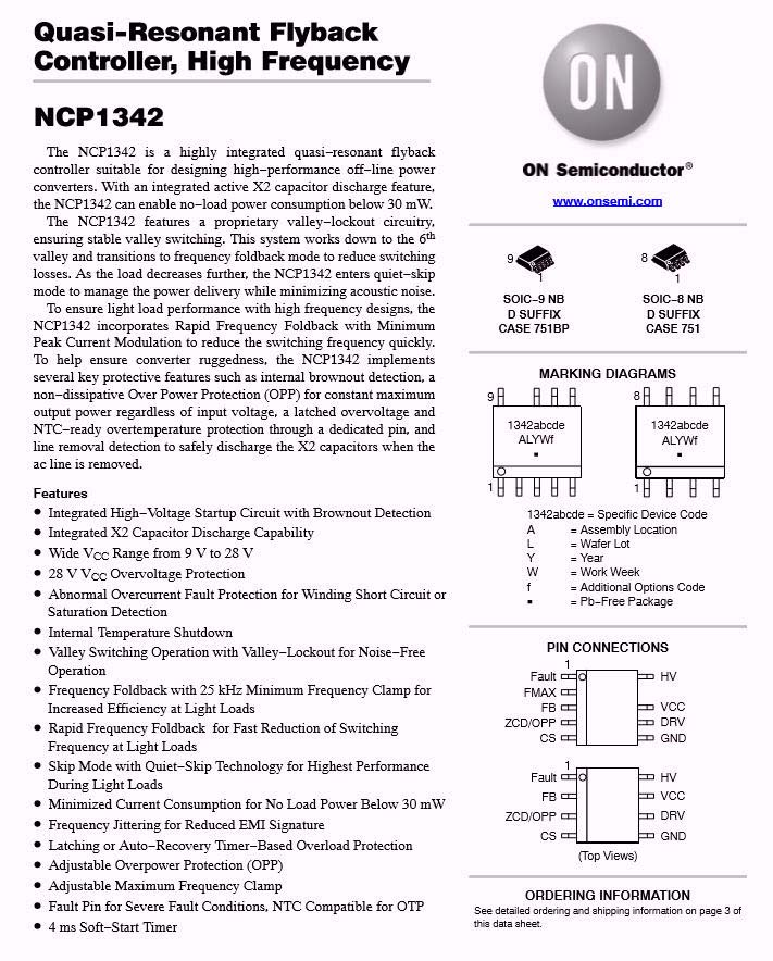 開關電源主控芯片采用ON安森美NCP1342,這是一顆高頻準諧振反激初級PWM控制器,內置主動X2電容放電和多重完善的保護功能,具有超低的待機功耗。