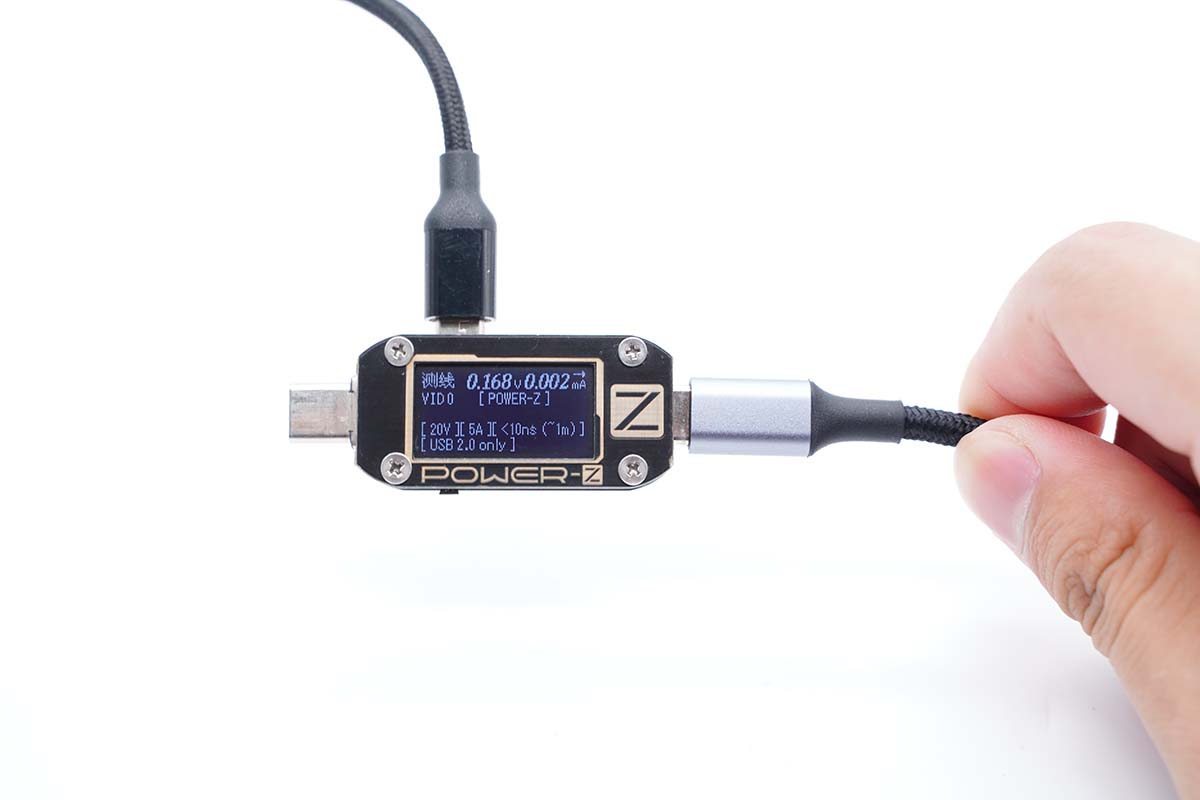 使用ChargerLAB POWER-Z KM001C檢測,顯示該線纜帶有E-Marker芯片,電力傳輸能力為20V5A,數據傳輸能力為USB 2.0。