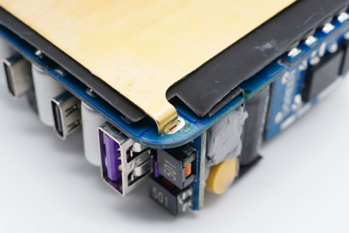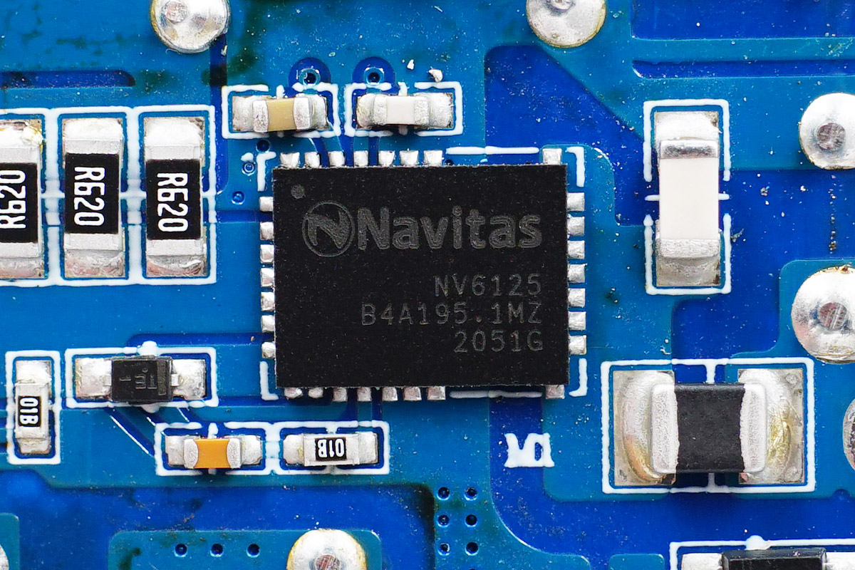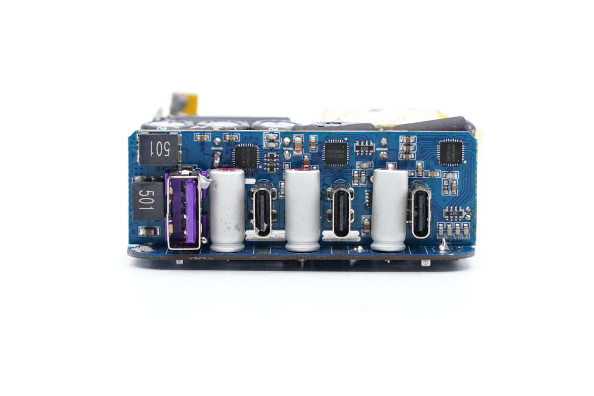 充電頭網通過拆解了解到,充電器輸入端設有一塊小板,三路降壓電路以及四個USB接口母座均在這塊小板上。充電器開關電源由安森美NCP1342主控搭配納微NV6125氮化鎵功率芯片。三路輸出均采用智融SW3516H方案,同時采用鈺邦固態電容進行二次濾波,品質有保證。