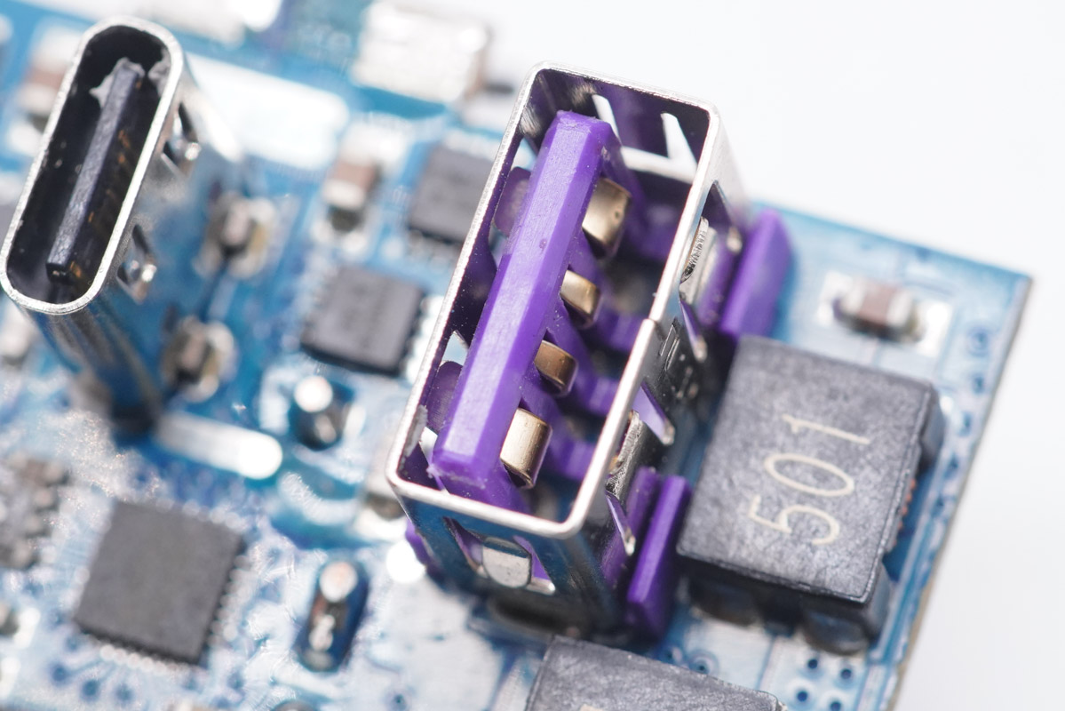 輸出端一覽,USB母座間共有三顆輸出濾波固態電容。