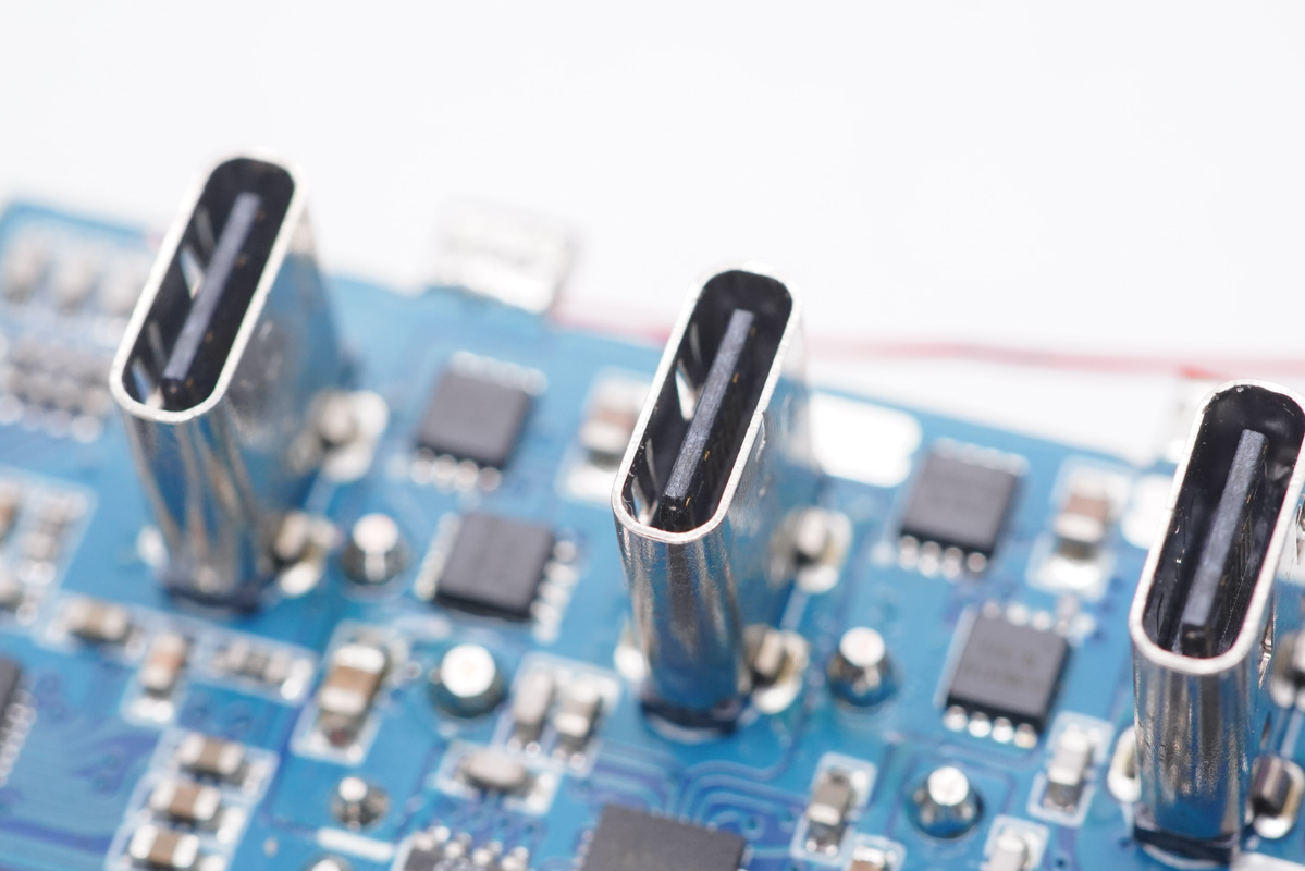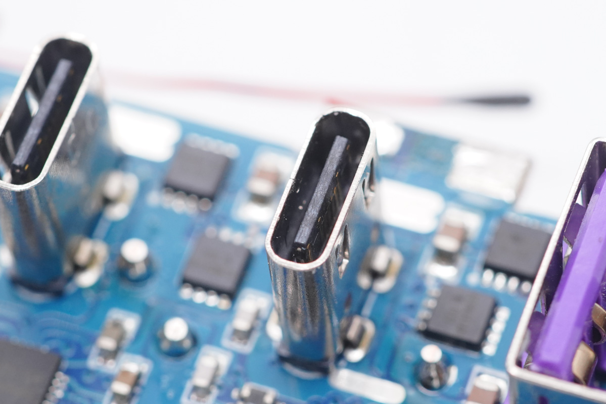 側面設有輸入端小板,輸出端也有一塊小板,四個USB母座均焊接在小板上。