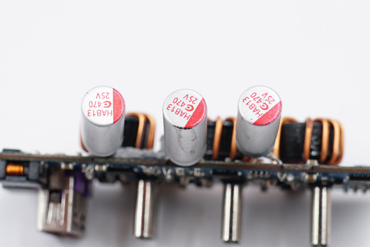 三顆二次降壓輸出濾波固態電容也是來自鈺邦,規格均為25V 470μF,分別負責三路降壓輸出濾波。
