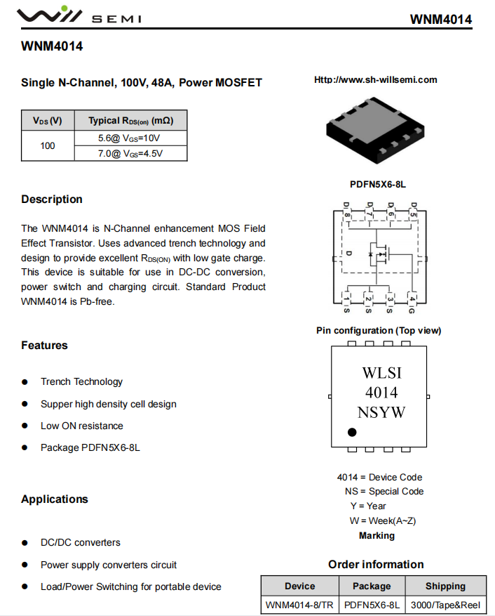 兩顆同步整流管,韋爾半導體WNM4014,NMOS管,耐壓100V,PDFN5x6-8L封裝。