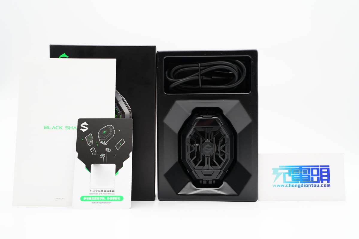 黑鯊散熱背夾和數據線分別放置在塑料盒的兩個凹槽里,此外還有說明書等。