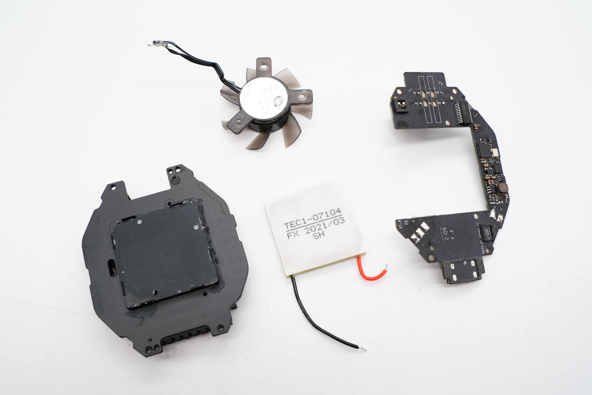 拆掉螺絲將機身殼打開,銅板和制冷晶片間涂有硅脂,加強導冷效果。