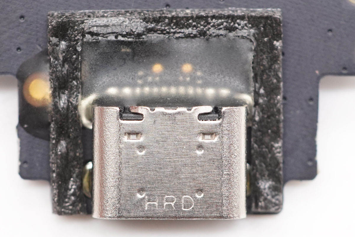 母座金屬殼上刻有HRD字樣,針腳焊接處注塑保護,外圍貼有U型泡棉。