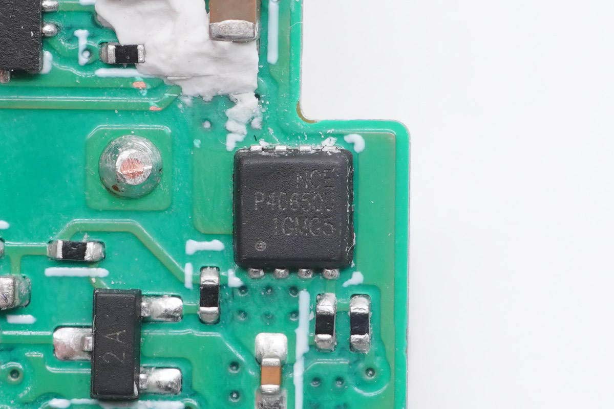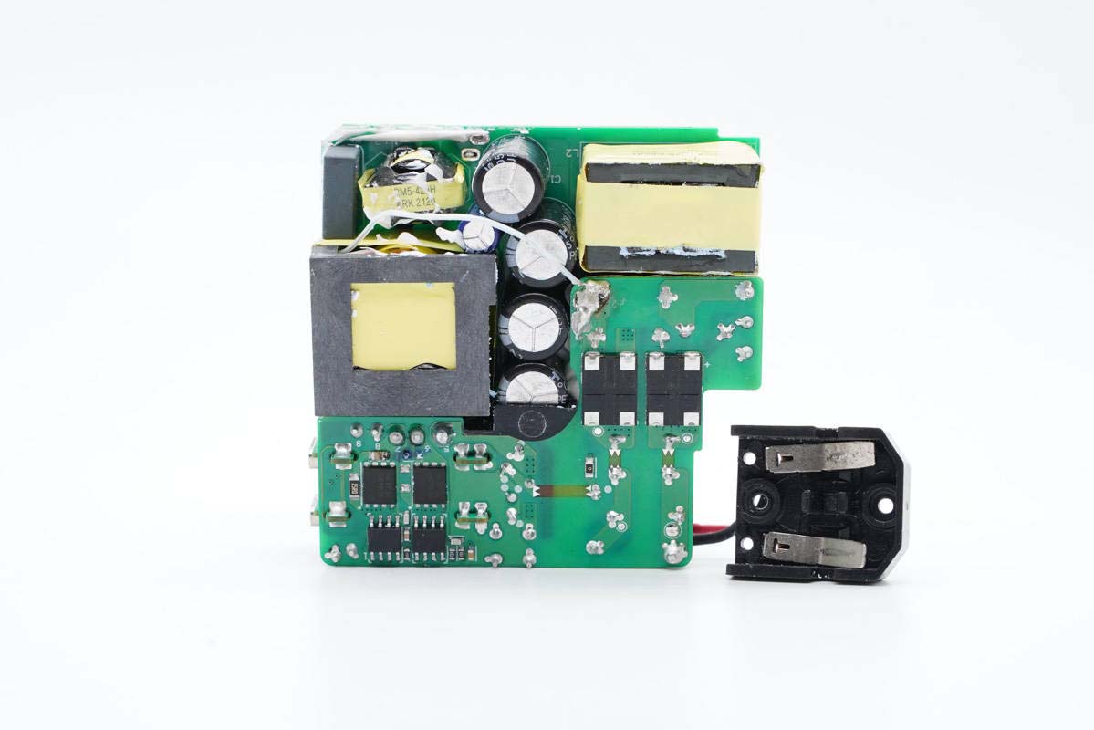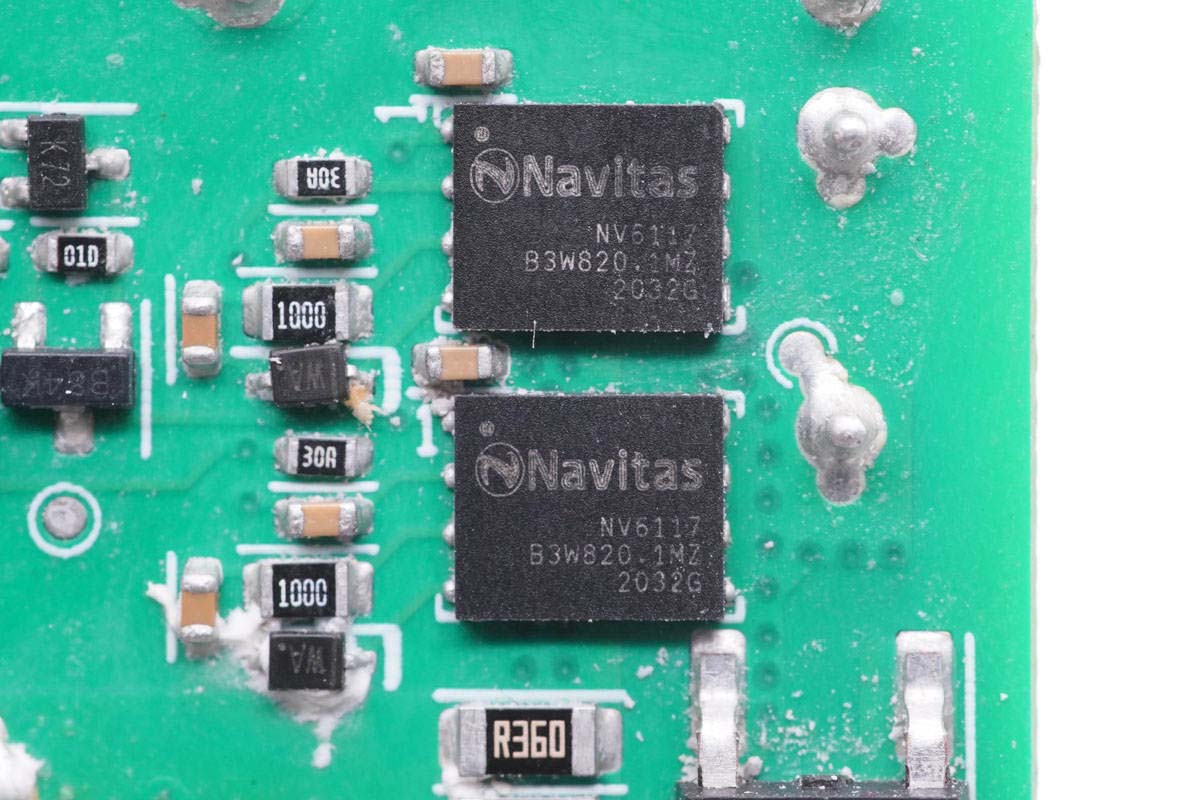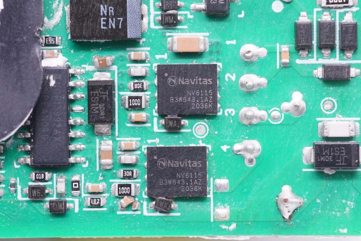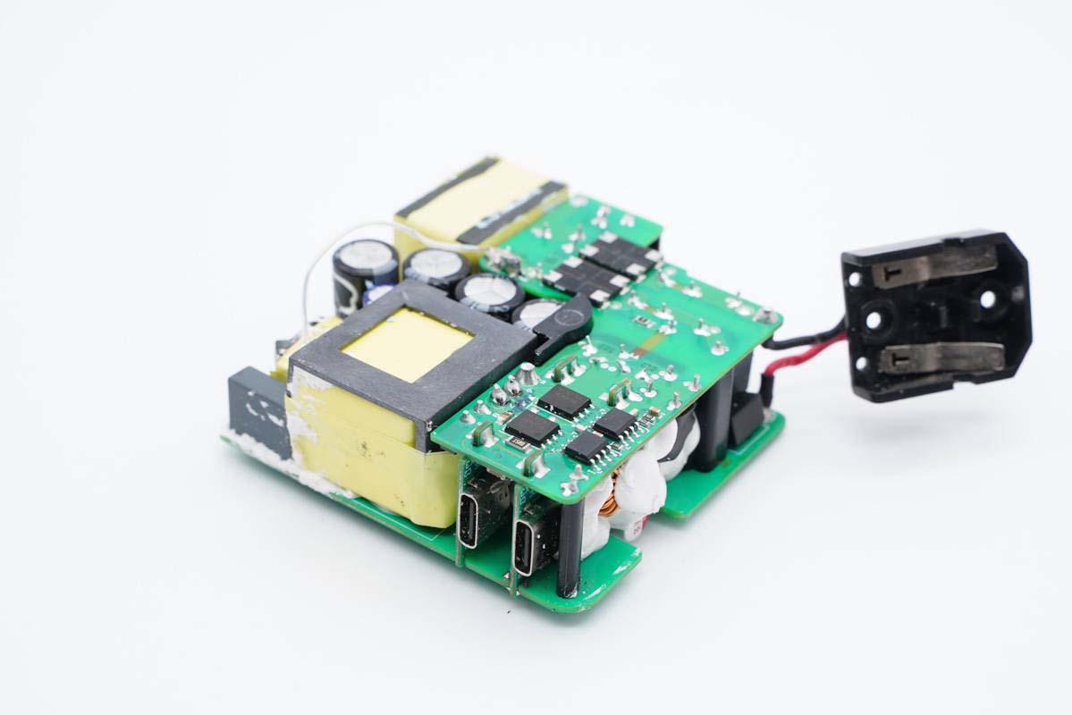 主板背面可以看到四顆納微的開關管,左上角兩顆用于PFC升壓開關管,頂部是PFC整流管,右側兩顆是LLC開關管。PCB上印有“LUXSHARE ICT”字樣,由立訊精密代工。