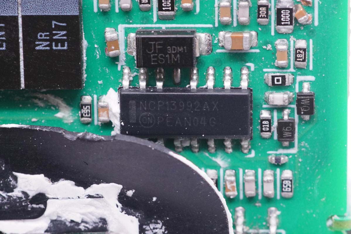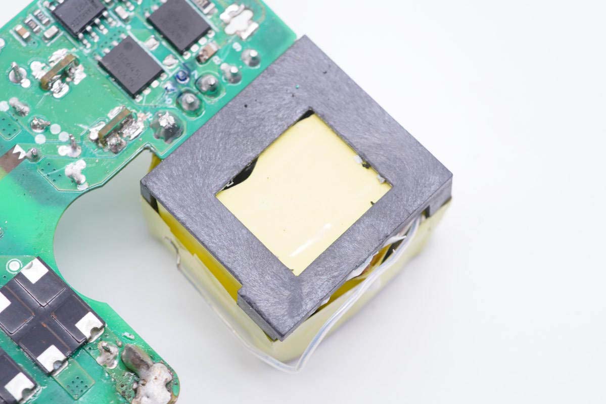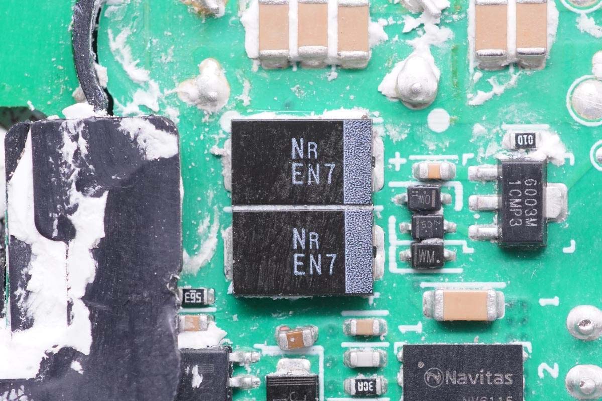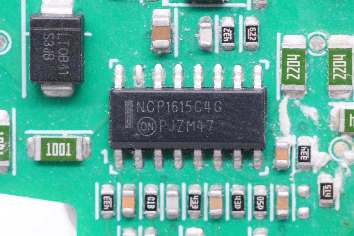 主板背面可以看到四顆納微的開關管,左上角兩顆用于PFC升壓開關管,頂部是PFC整流管,右側兩顆是LLC開關管。PCB上印有“LUXSHARE ICT”字樣,由立訊精密代工。