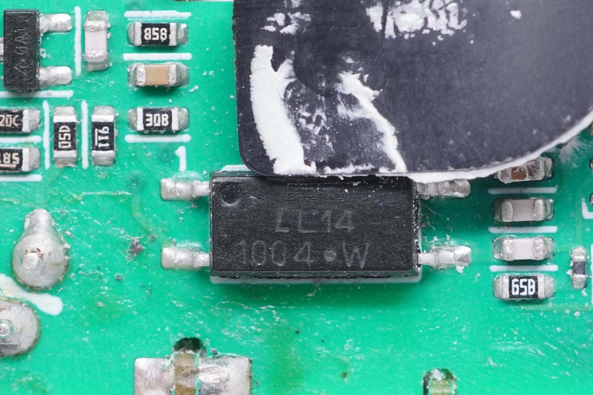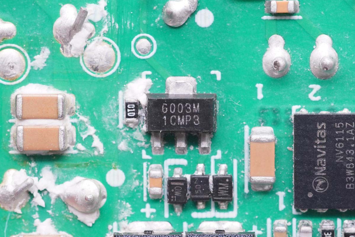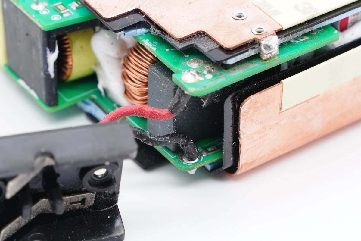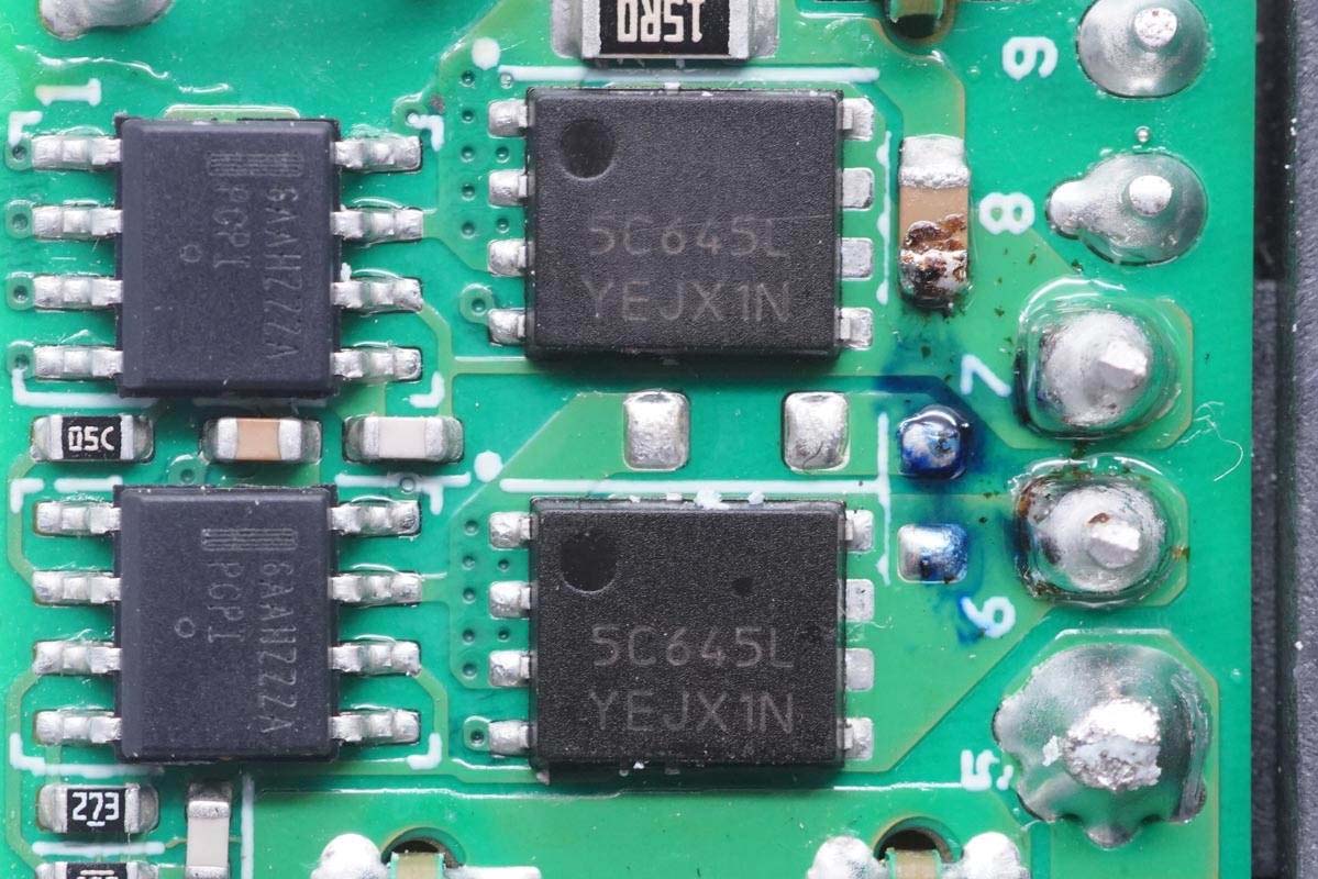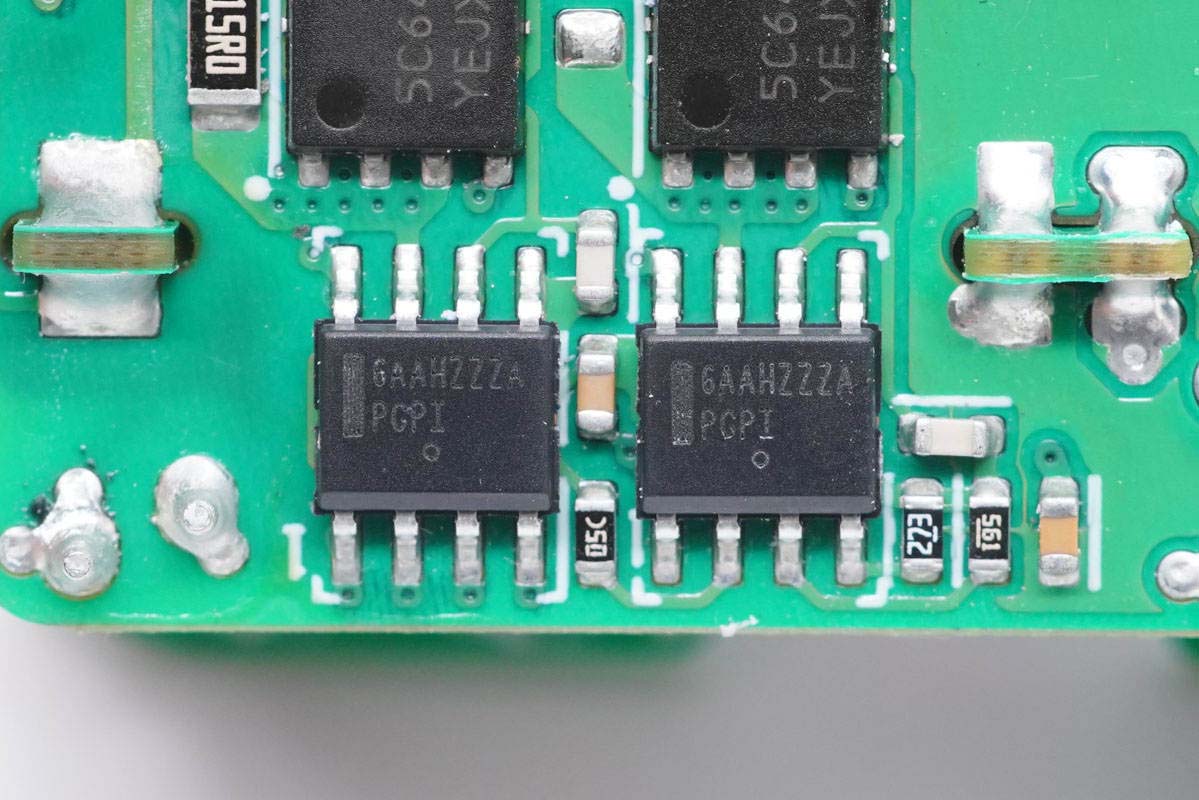 主板背面可以看到四顆納微的開關管,左上角兩顆用于PFC升壓開關管,頂部是PFC整流管,右側兩顆是LLC開關管。PCB上印有“LUXSHARE ICT”字樣,由立訊精密代工。