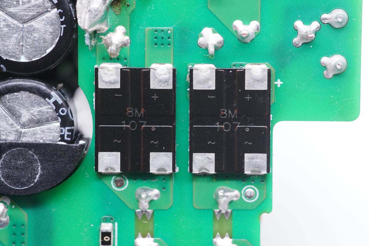 上面這塊小板,左邊是低壓部分,變壓器輸出同步整流,采用LLC架構。右側是兩顆整流橋,用于輸入整流,右上角是PFC升壓電感,中間是初級濾波電容。