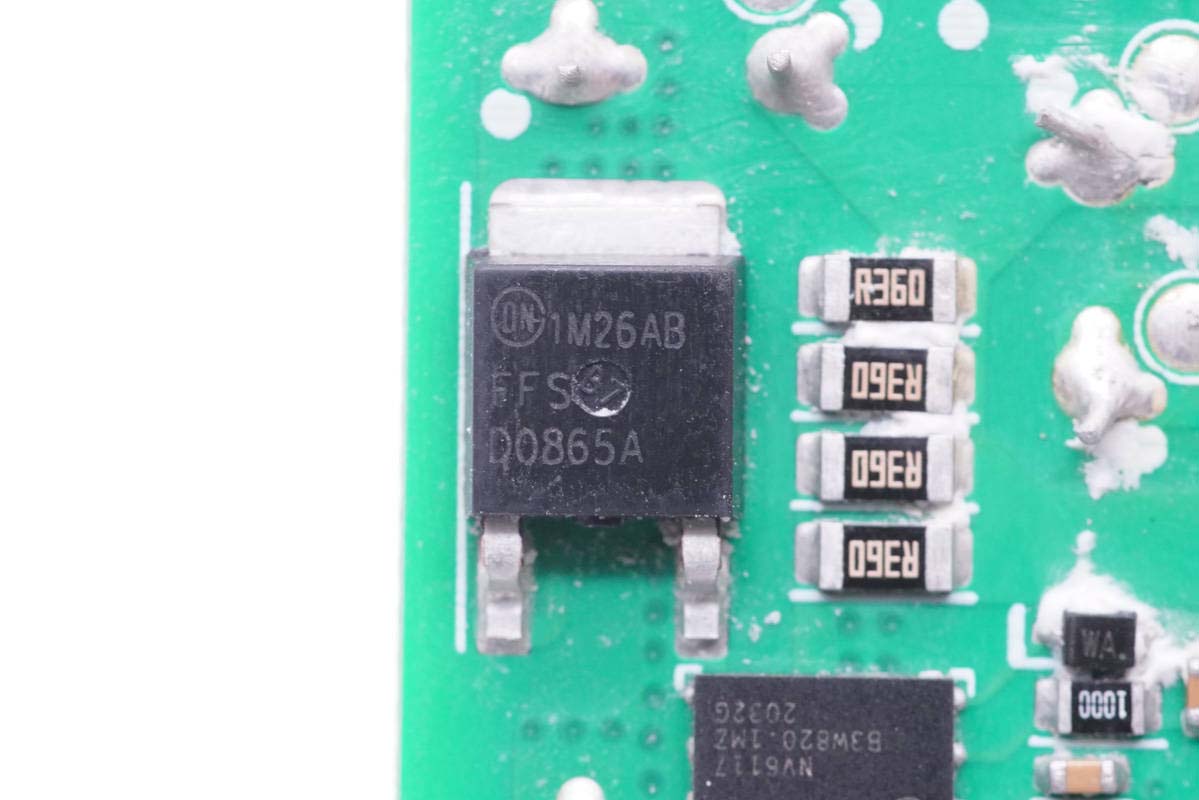 PFC整流管采用安森美 FFSD0865A,8A碳化硅二極管,最高結溫175℃,耐壓650V,8A電流,右側四顆0.36Ω電阻并聯用于電流檢測。