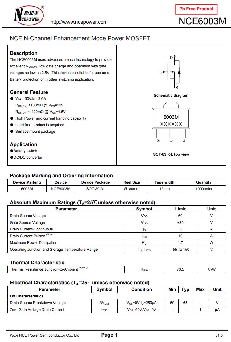新功率 NCE6003M 詳細資料。