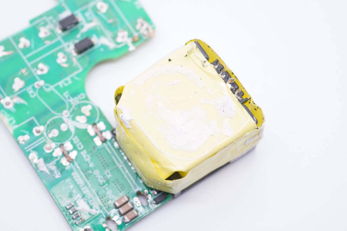 變壓器包裹絕緣膠帶,頂部打膠幫助導熱和固定。