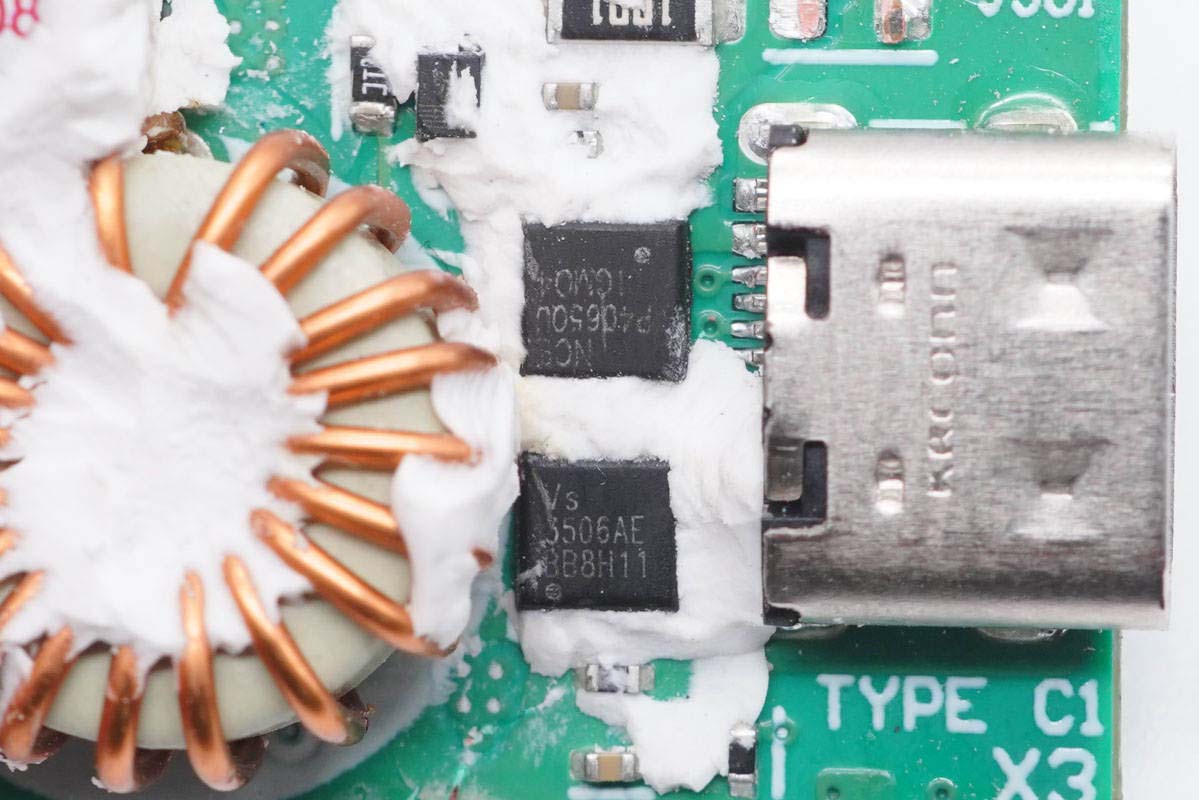 輸出VBUS開關管采用威兆VS3506AE,PMOS,耐壓30V,PDFN3333封裝。USB-C公頭金屬殼上有KRCONN字樣,表明母座來自精睿科技。