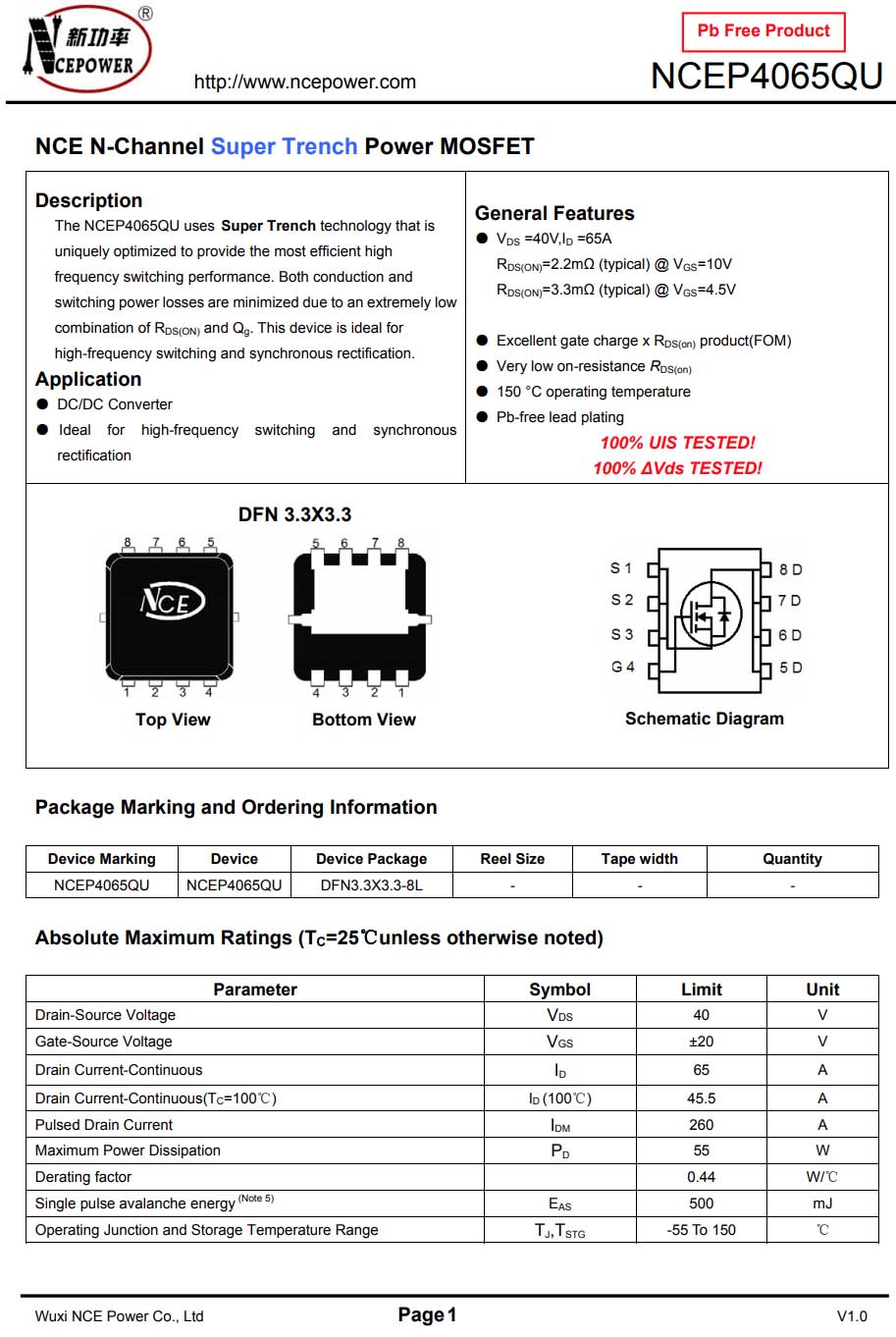 無錫新功率 NCEP4065QU 詳細資料。