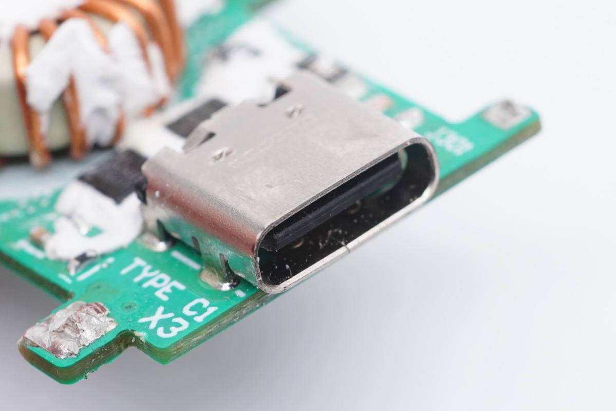 USB-C母座特寫,黑色膠芯,過孔焊接。