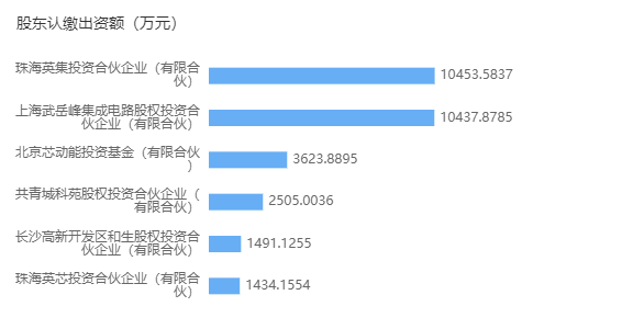 認(rèn)繳出資額中,珠海英集投資合伙企業(yè)最多,為10453.5837萬元;上海武岳峰集成電路股權(quán)投資合伙企業(yè)緊隨其后,認(rèn)繳10437/8785萬元。