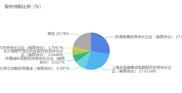 股東持股比例中,珠海英集占比27.655%,上海武岳峰占比27.6134%;另外四大股東占比則都不超過10%;其他占比約為20.78%。
