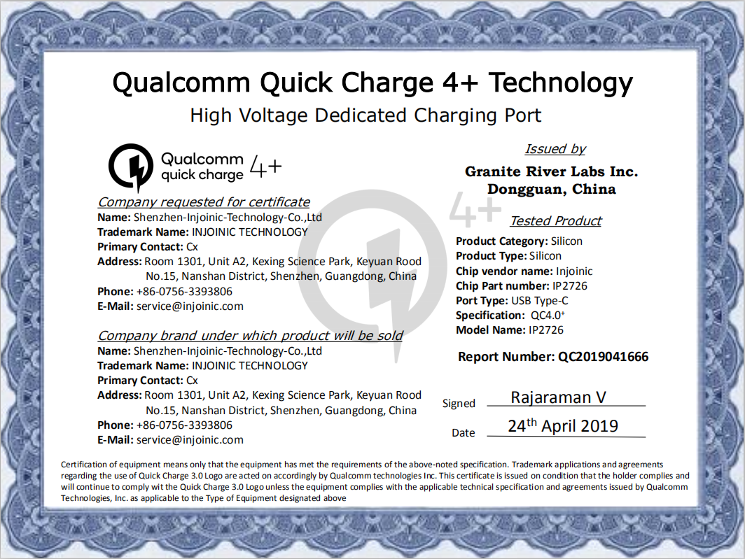 先說高通。在QC4.0時(shí)代,英集芯科技作為配件的芯片解決方案領(lǐng)導(dǎo)者,打破QC4.0/QC4.0+認(rèn)證許可芯片只有歐美,臺系廠商的局面,成為國內(nèi)首家獲得高通QC4.0/QC4.0+認(rèn)證許可廠商,證書編號QC2019041666。