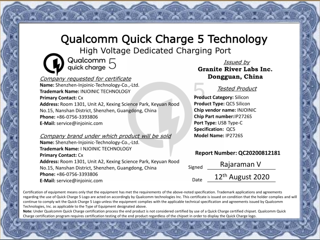 到了QC5時(shí)代,高通頒布第一張QC5快充芯片認(rèn)證證書,英集芯拔得頭籌!英集芯市場總監(jiān)彭峰稱:“與高通和GRL緊密的合作,使得我們再次走到了快充技術(shù)的最前列,我們將致力于給客戶提供最新最優(yōu)質(zhì)的解決方案,推動QuickCharge技術(shù)的推廣。”