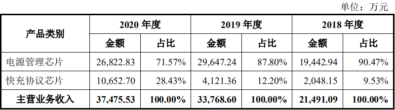 確實(shí)如此,從2018年到2020年, 英集芯的主營業(yè)務(wù)收入全部來自電源管理、快充協(xié)議芯片。從數(shù)據(jù)也可以看出,總營收快速增長的同時(shí),快充協(xié)議芯片占比從9.53%提升至28.43%,側(cè)面印證近年快充協(xié)議的發(fā)展。